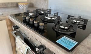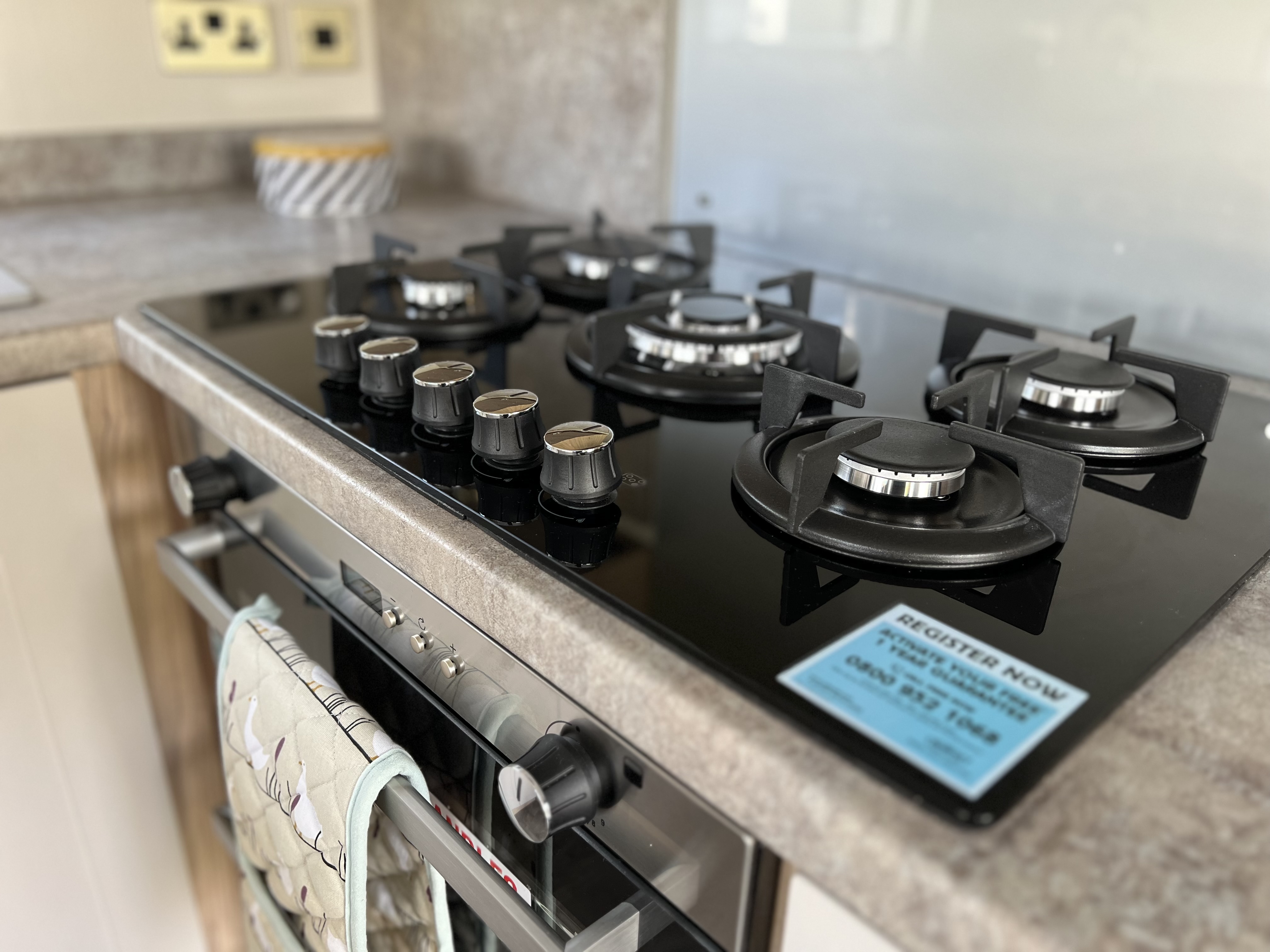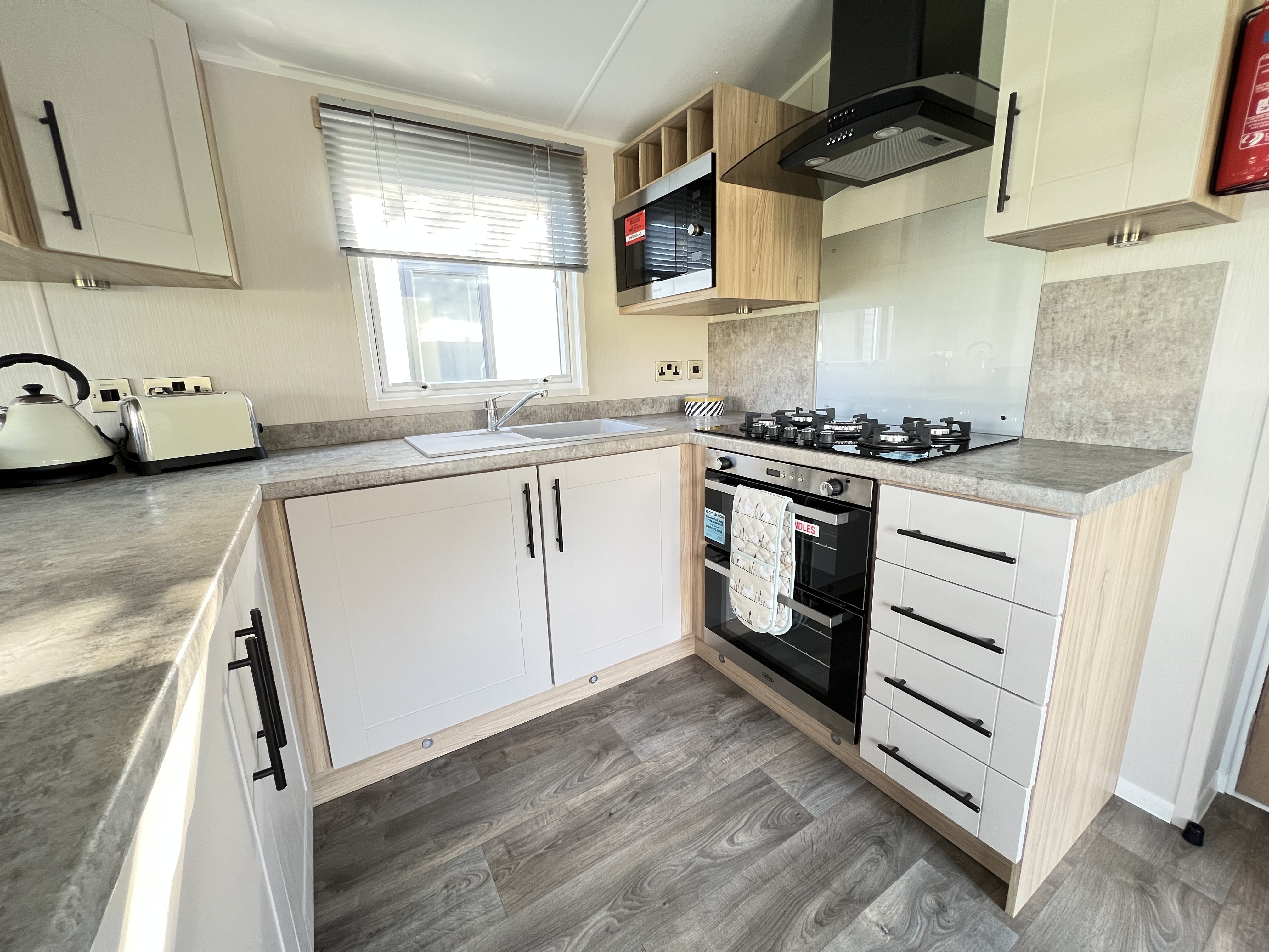 Stylish dining kitchen with ample cupboards and shelving, built-in oven and hob, plus integrated microwave, fridge and freezer and wine rack.