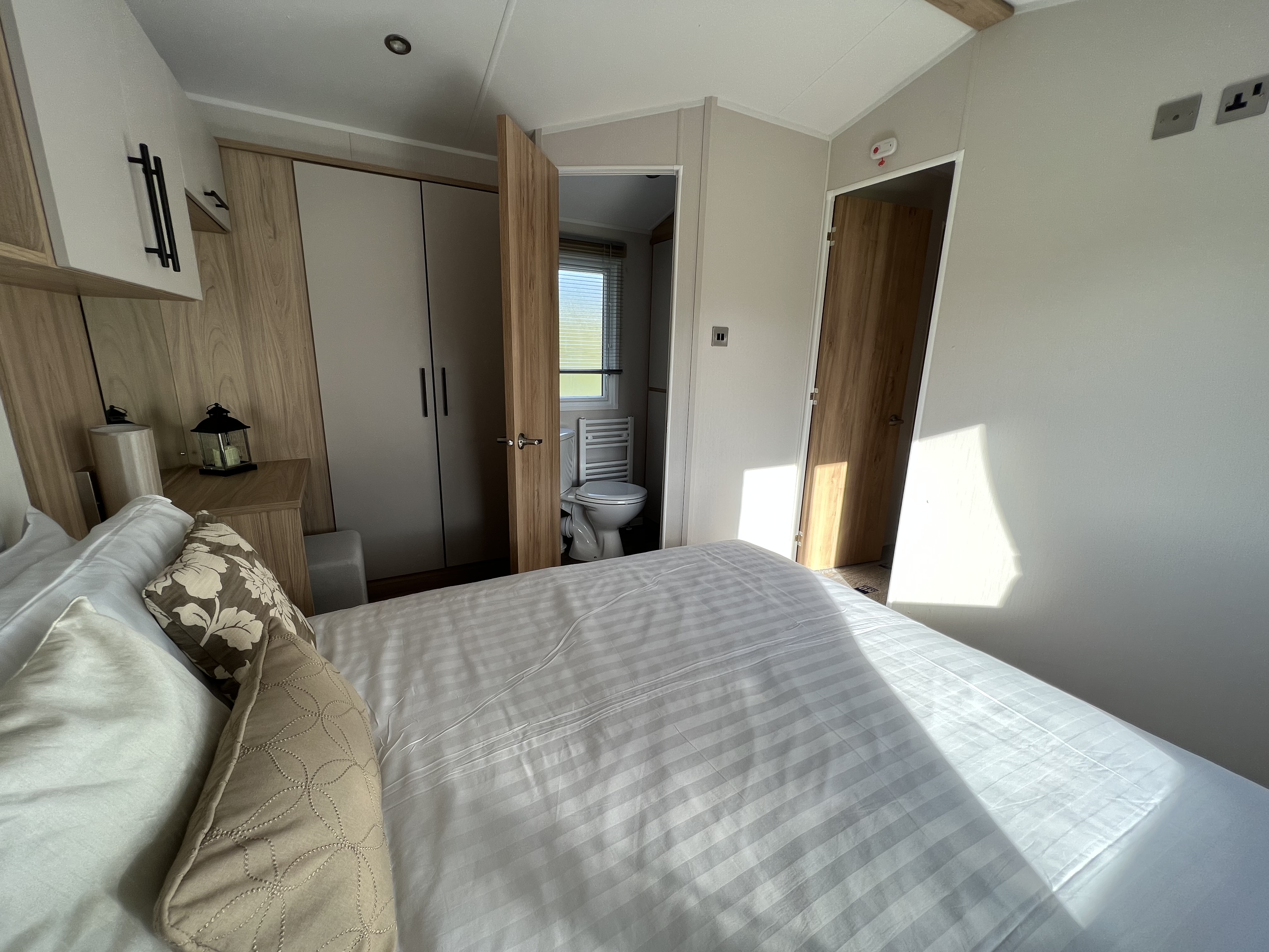 Master bedroom with double ottoman under storage bed, fitted wardrobes, en-suite WC with mirrored cupboard.