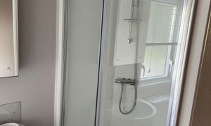 Family bathroom with shower cubicle, sink, and WC.