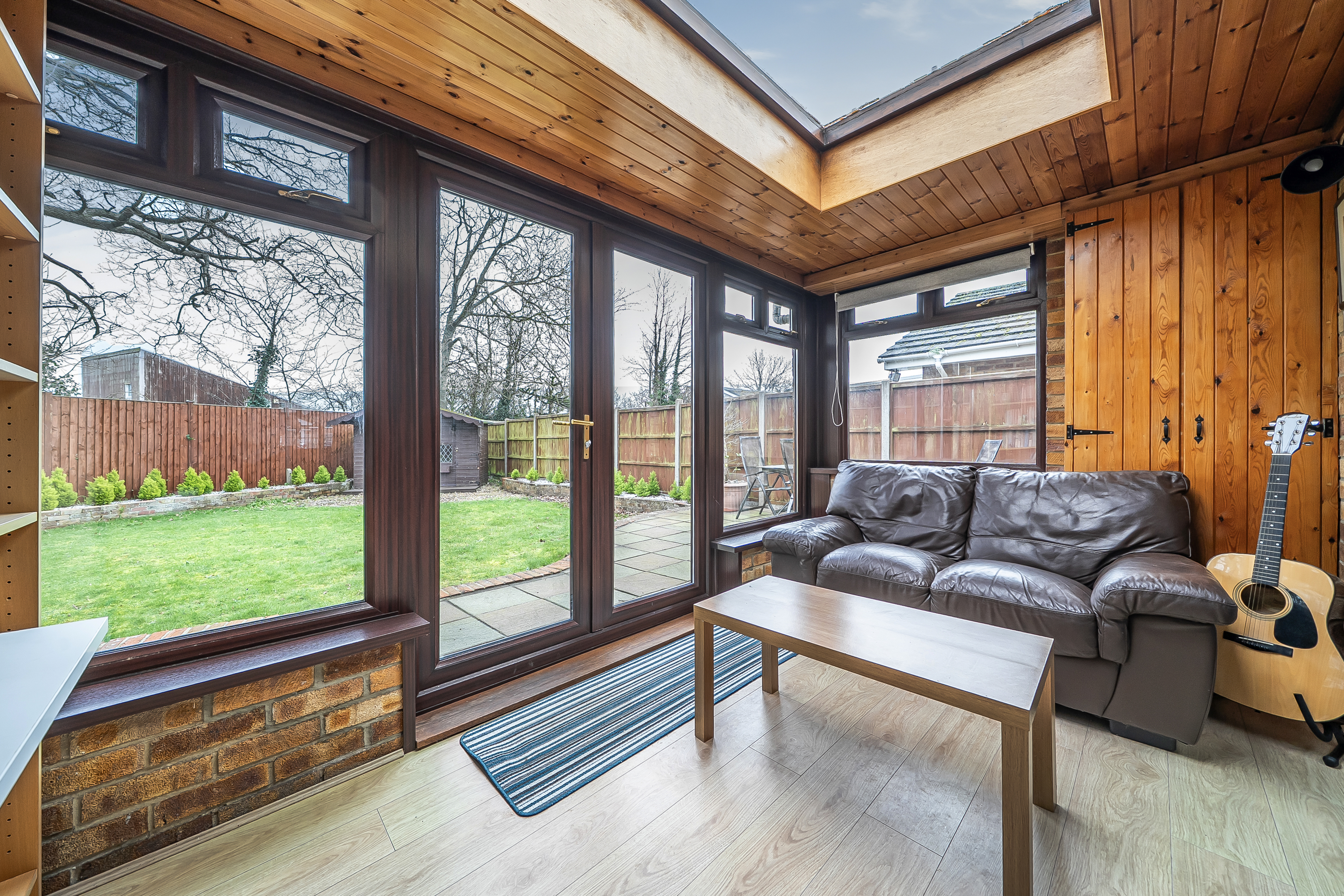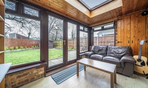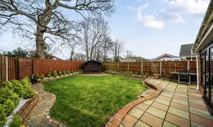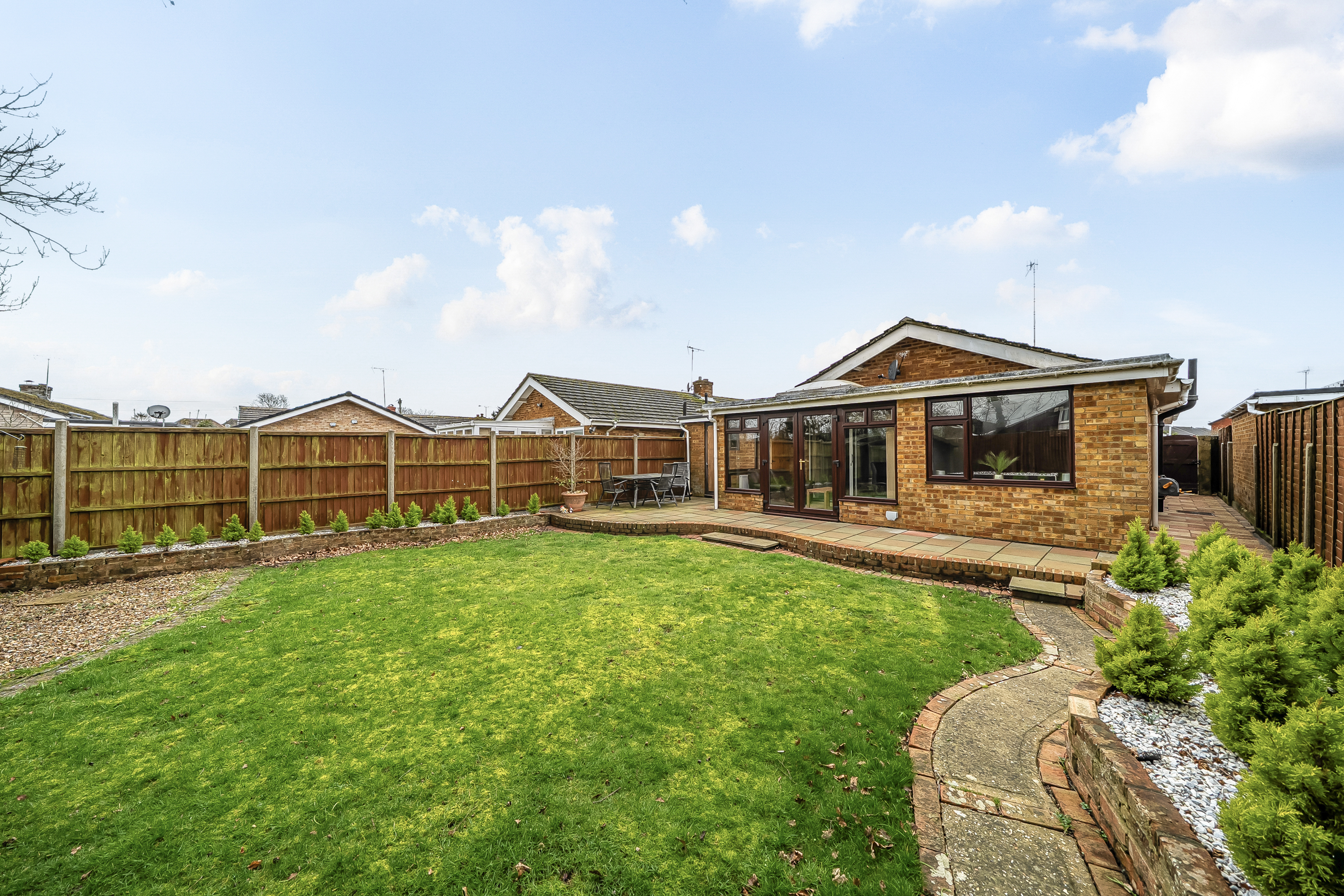 The well-arranged and light accommodation is laid out over one floor. As you enter there is a hall which gives access to a large sitting/dining room which is full of natural light. There are two double bedrooms, both complete with bespoke fitted wardrobes. A conservatory looks out over the well-kept garden. A fitted kitchen/breakfast room, separate wc and family bathroom complete the accommodation. Outside to the rear there is an enclosed garden which is mainly laid to lawn and has a terrace and both side and rear gates for access. To the front there is ample driveway parking for a number of vehicles and a garage. The latter complete with an up and over entrance door.