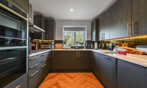 The recently updated kitchen has been thoughtfully designed with both practicality and aesthetics in mind. Finished to an exceptional standard, it features sleek matte cabinetry with brass handles, integrated modern appliances, and contrasting worktops that complement the deep tones of the units. Under-cabinet lighting enhances the luxurious feel, while the layout offers ample storage and workspace — ideal for any keen home cook or busy family.