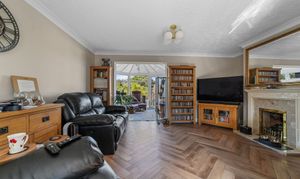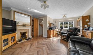 From the moment you arrive, the attractive red-brick exterior, neat frontage, and private driveway leading to a detached garage immediately set the tone for the quality within. The entrance hall welcomes you into the home, providing access to the main living spaces and a convenient ground-floor WC. The bright and inviting sitting room extends the full width of the property, featuring elegant herringbone-style flooring, a contemporary neutral décor, and a focal-point gas fireplace that creates a warm and relaxing atmosphere. Large windows allow natural light to flood the space, while double doors open seamlessly into the conservatory — a light-filled retreat perfect for morning coffee, reading, or entertaining guests while enjoying delightful views over the rear garden.