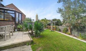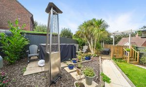 Externally, the rear garden is a true highlight — a well-maintained and thoughtfully landscaped space with a mix of patio, lawn, and mature planting. The elevated terrace provides an ideal spot for outdoor dining and entertaining, while steps lead down to a lawn bordered by decorative shrubs and palms, giving the garden a relaxed, almost Mediterranean feel. The garden also includes a charming pergola and seating area, perfect for enjoying sunny afternoons.