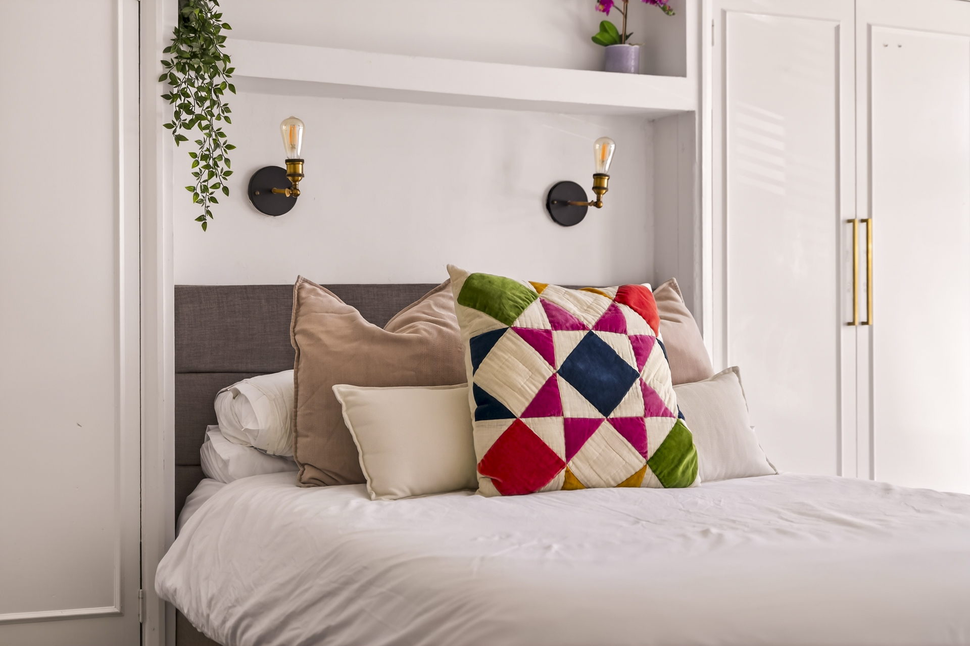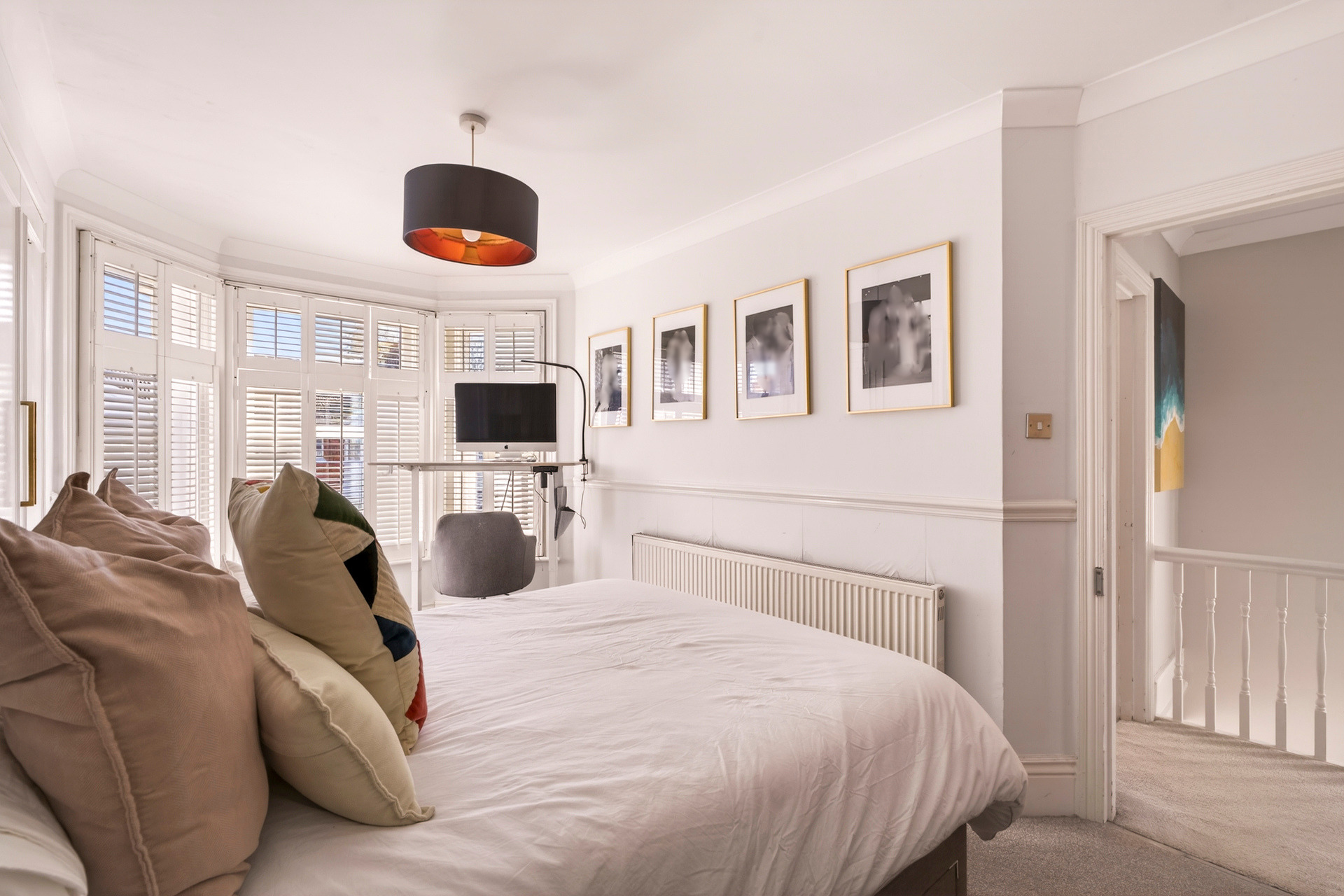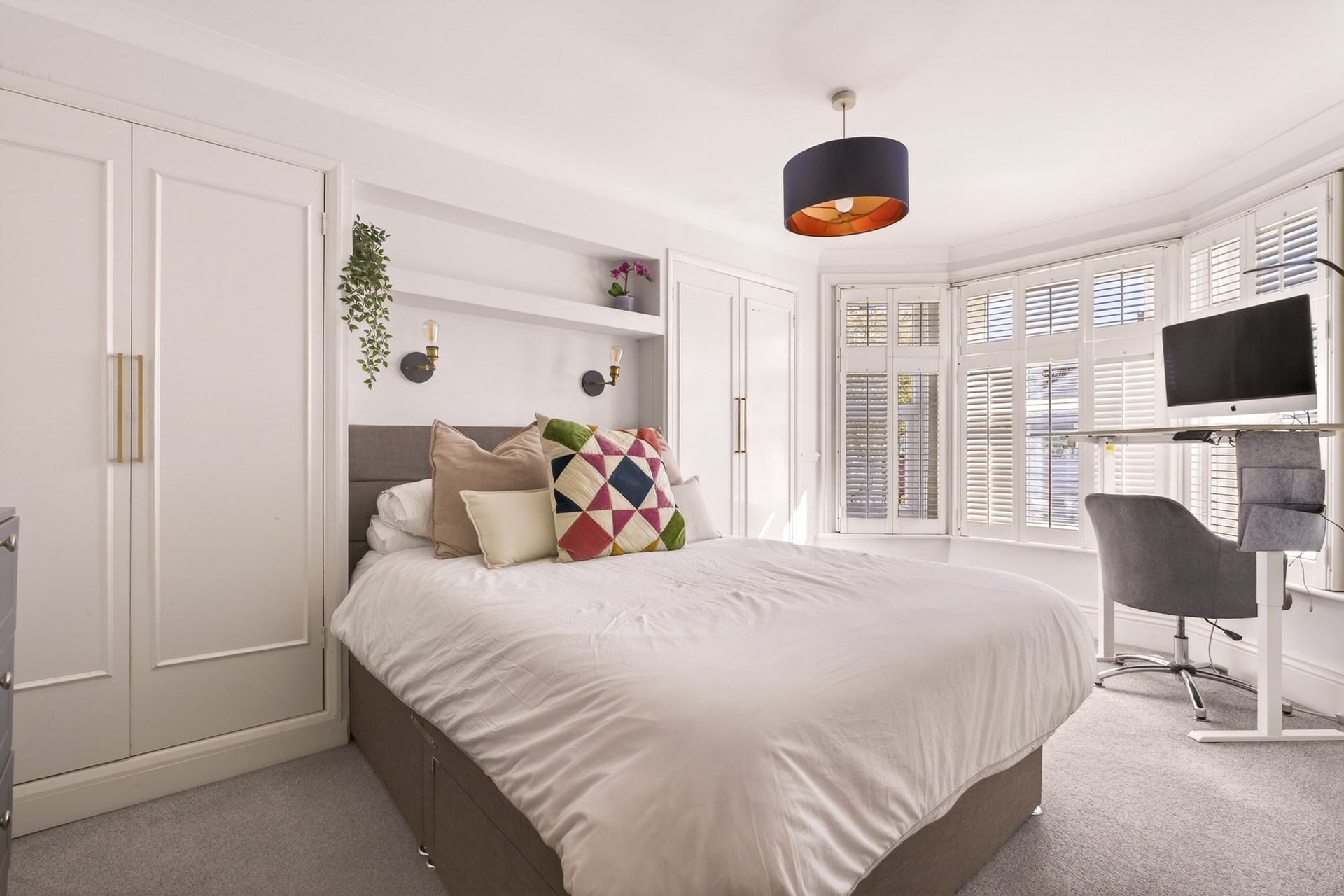 Main bedroom with a large bay window and built-in storage.