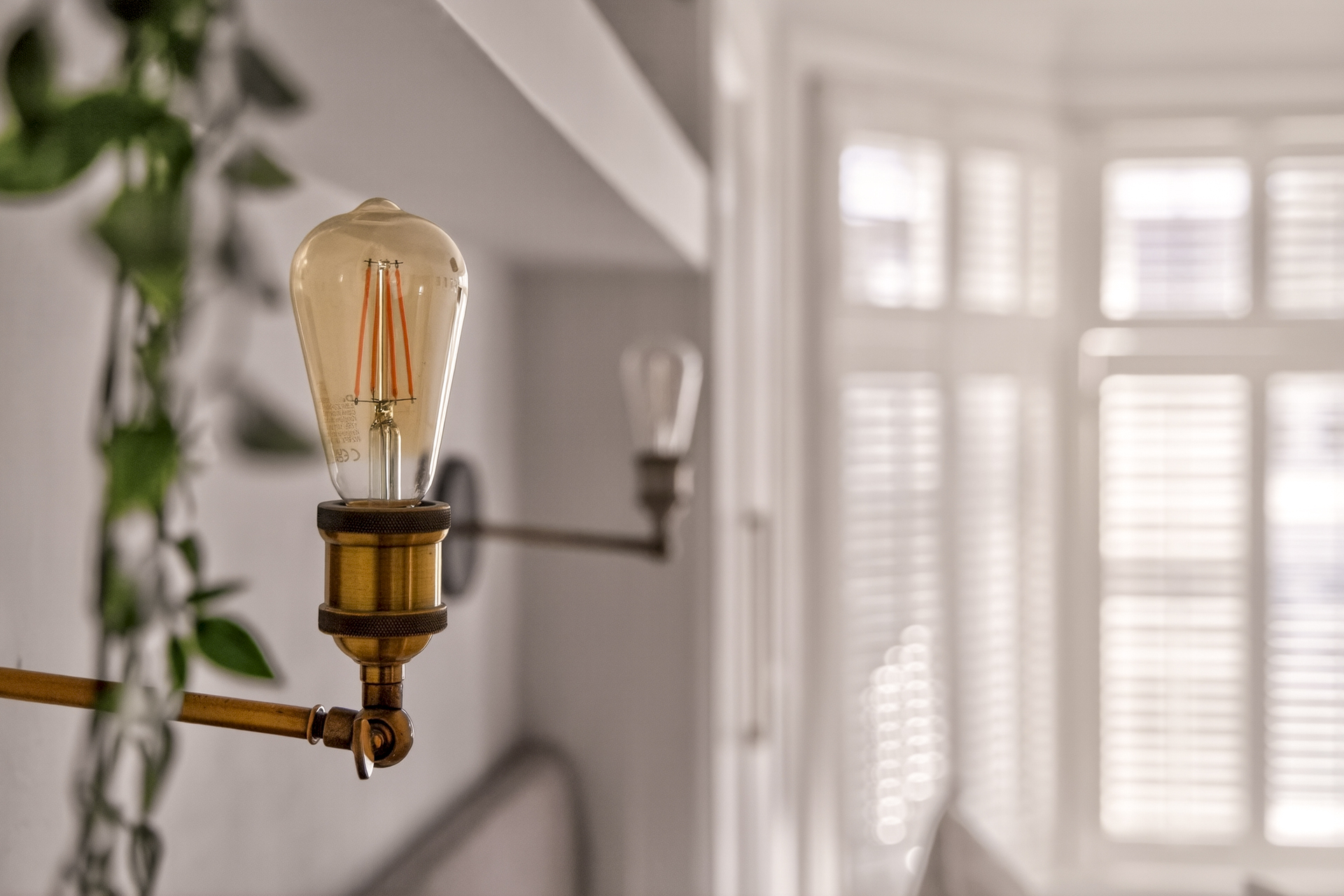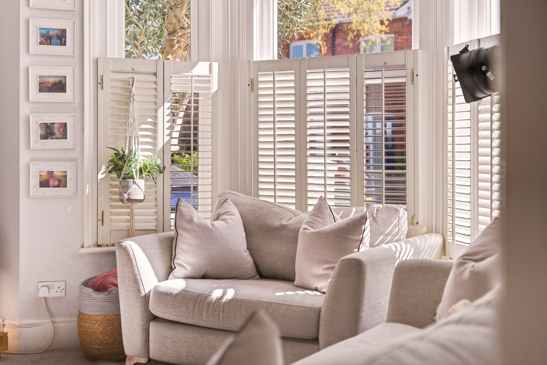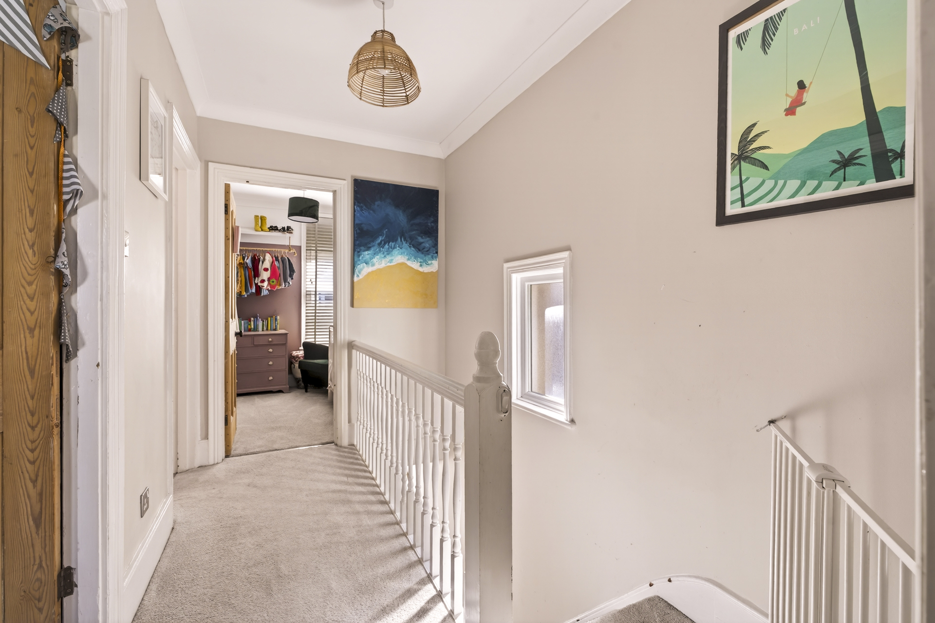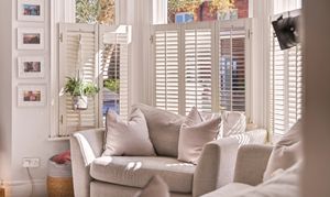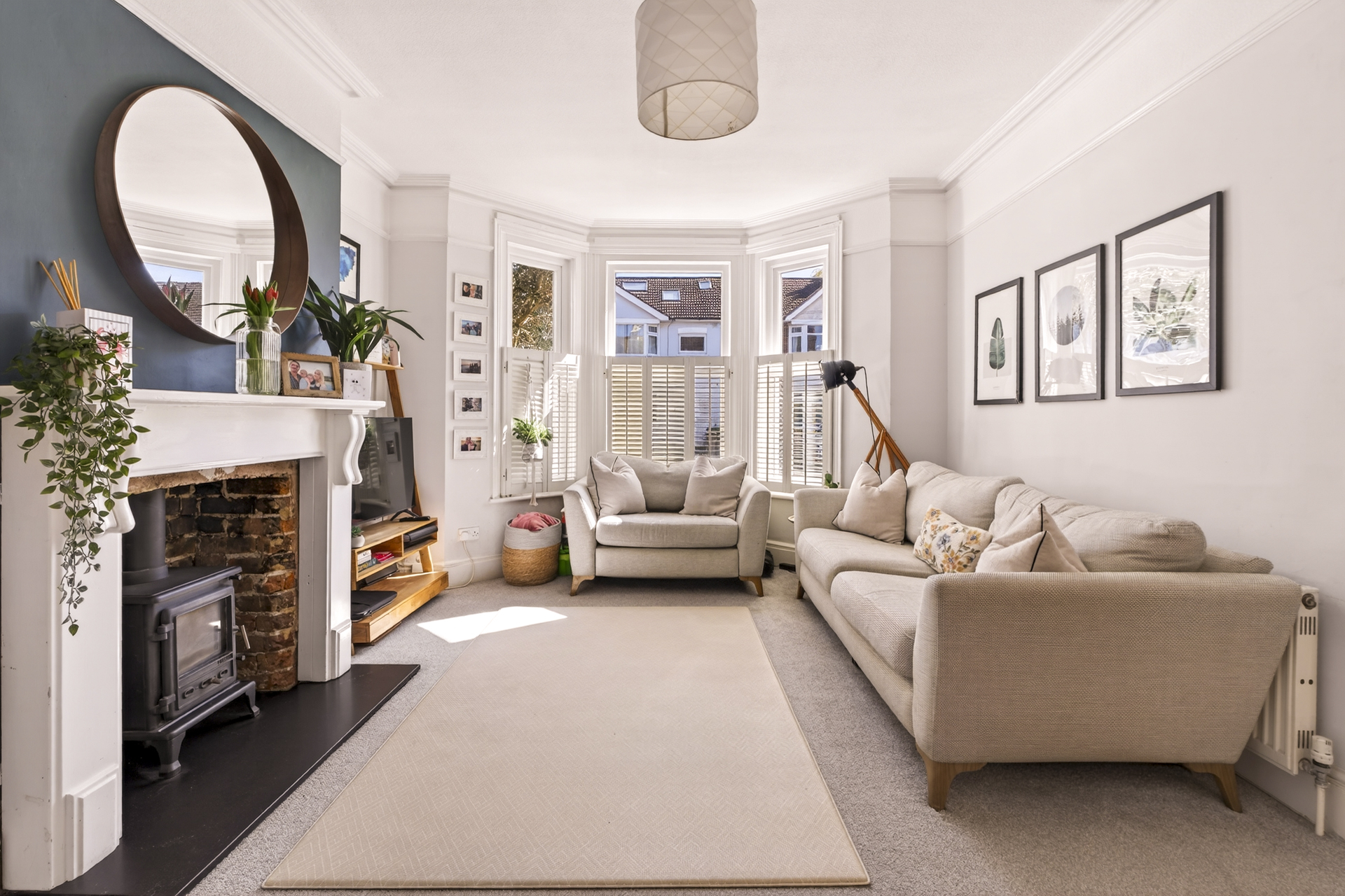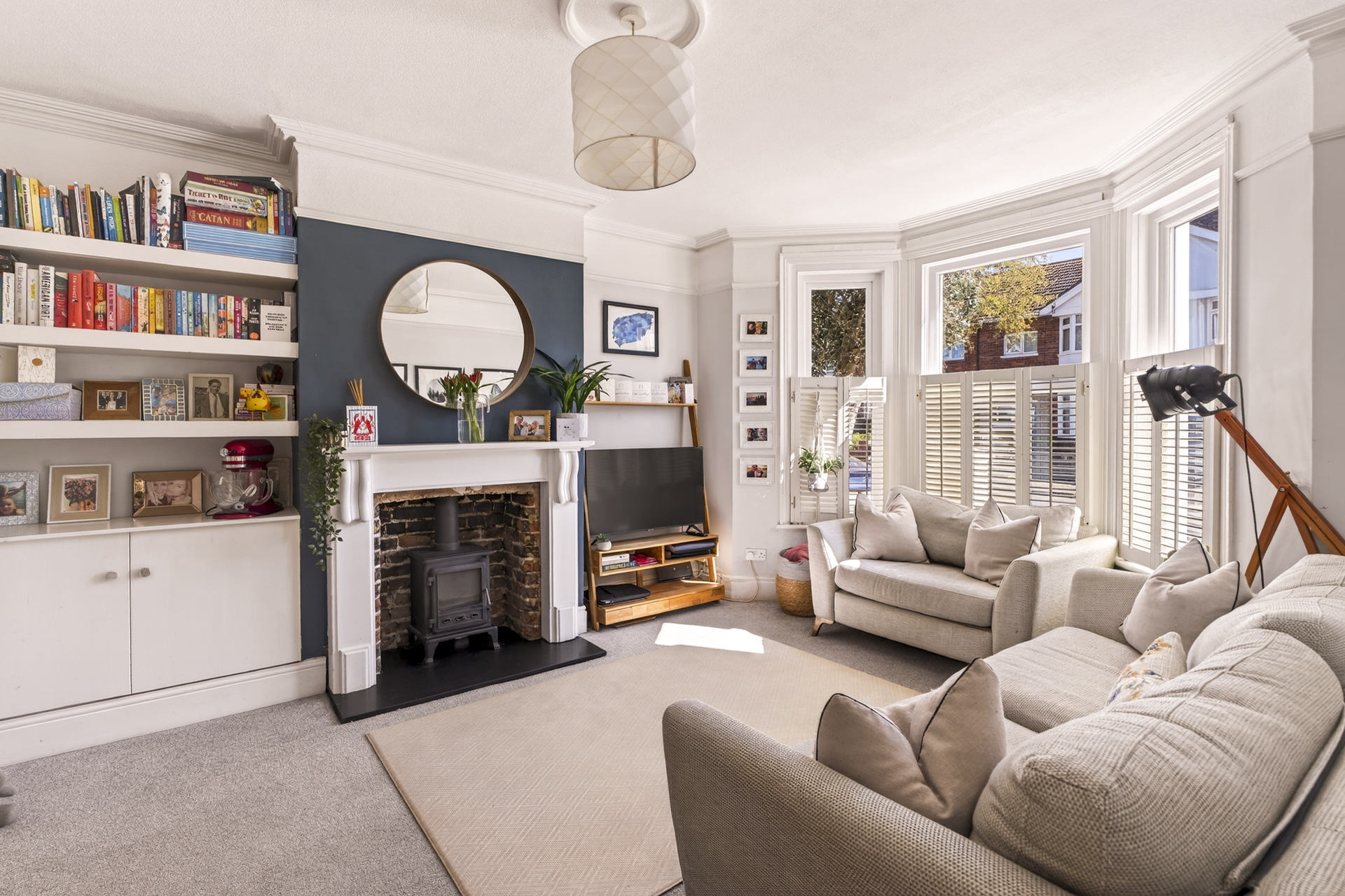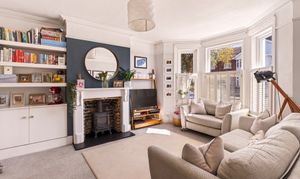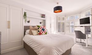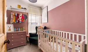 Upstairs, three bedrooms and a family bathroom lead off from a bright hallway. The main and third bedrooms are situated to the front of the house, with the second towards the back. The main bedroom features a fantastic large bay window with double glazing and stylish wooden shutters. Inbuilt storage and shelving give the room a clutter-free, serene feel.