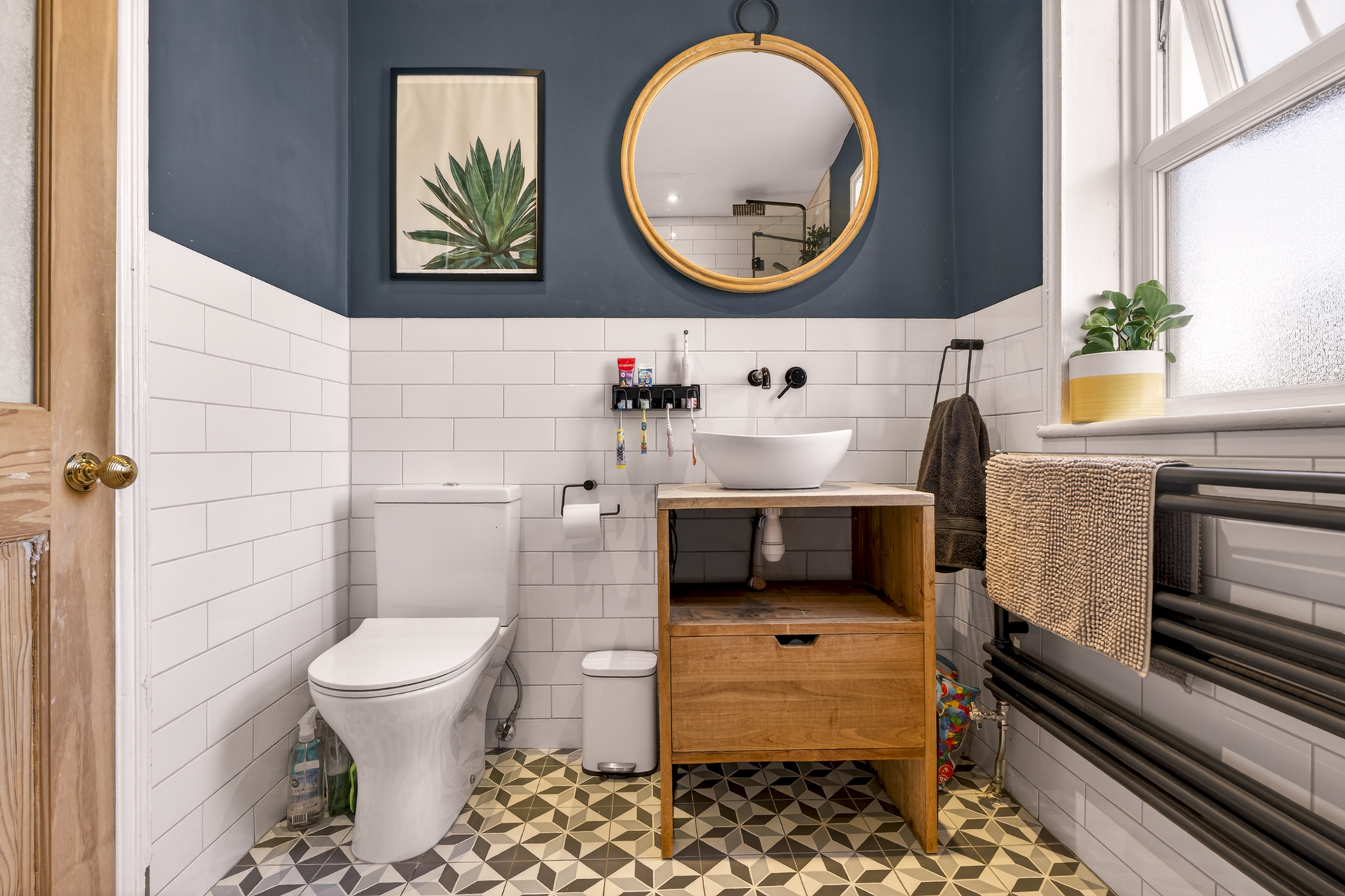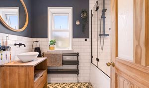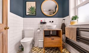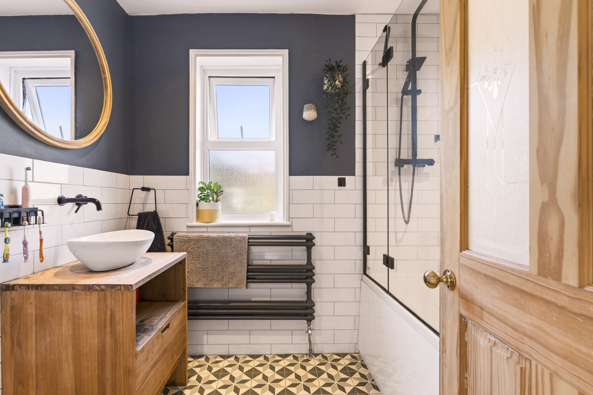 The stylish family bathroom is situated at the back of the house features a bath with dual showerhead integrated shower, loo and sink with a wooden vanity unit.