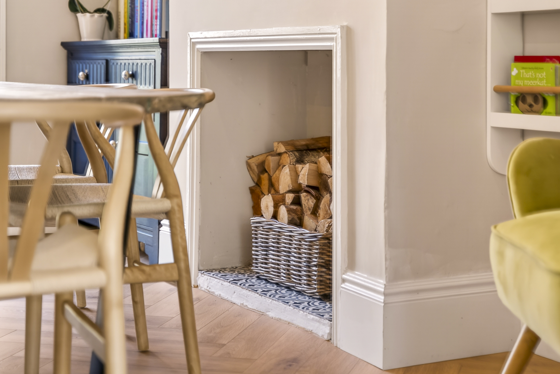The downstairs space flows seamlessly through the hallway, with a cleverly created downstairs wc, towards the stylish, yet neutral, kitchen with hardwood worktops. From the kitchen a slight difference in floor level and low dividing wall create a semi-open plan layout into the spacious dining area, with herringbone flooring throughout. Both the kitchen and dining area benefits from underfloor heating. A smart set of bifold doors separates the dining and kitchen areas from the welcoming living room.