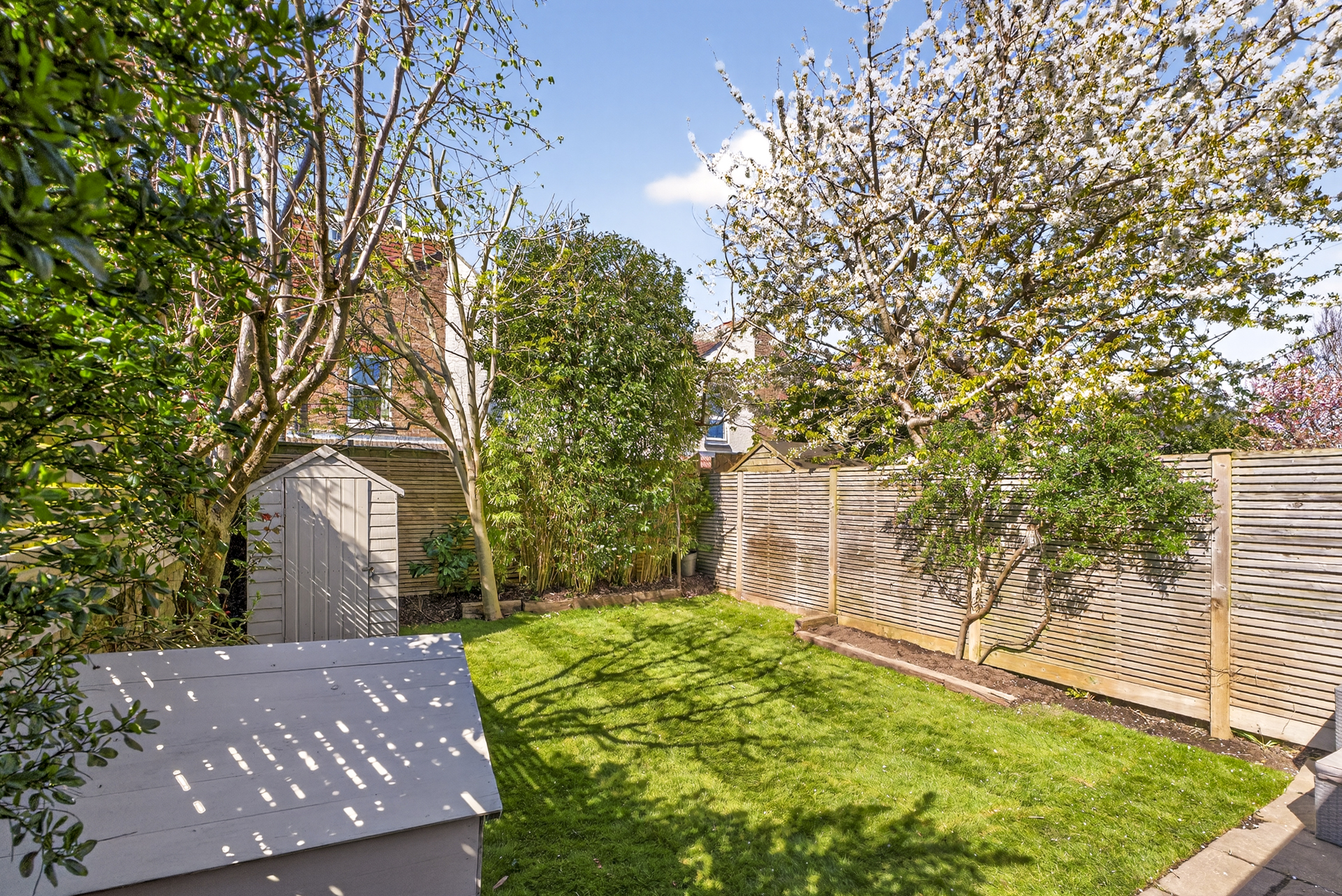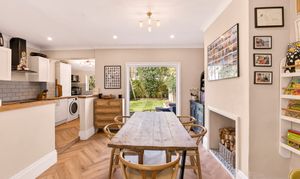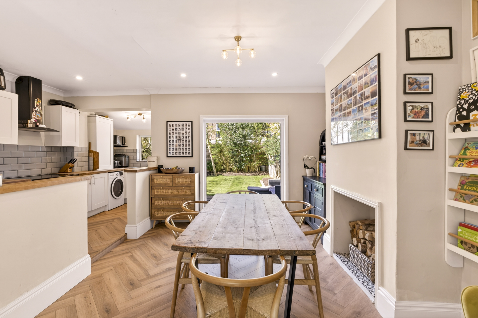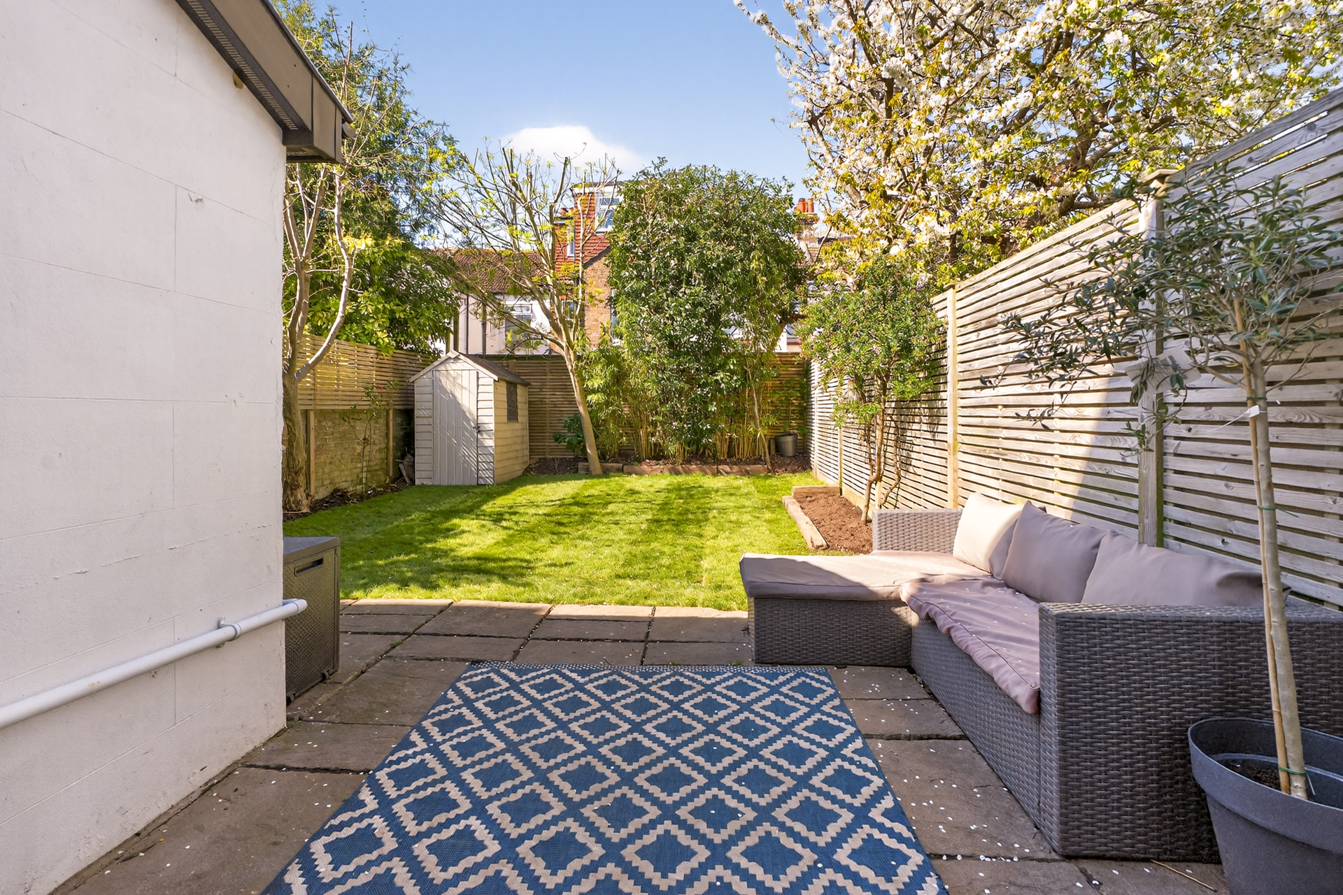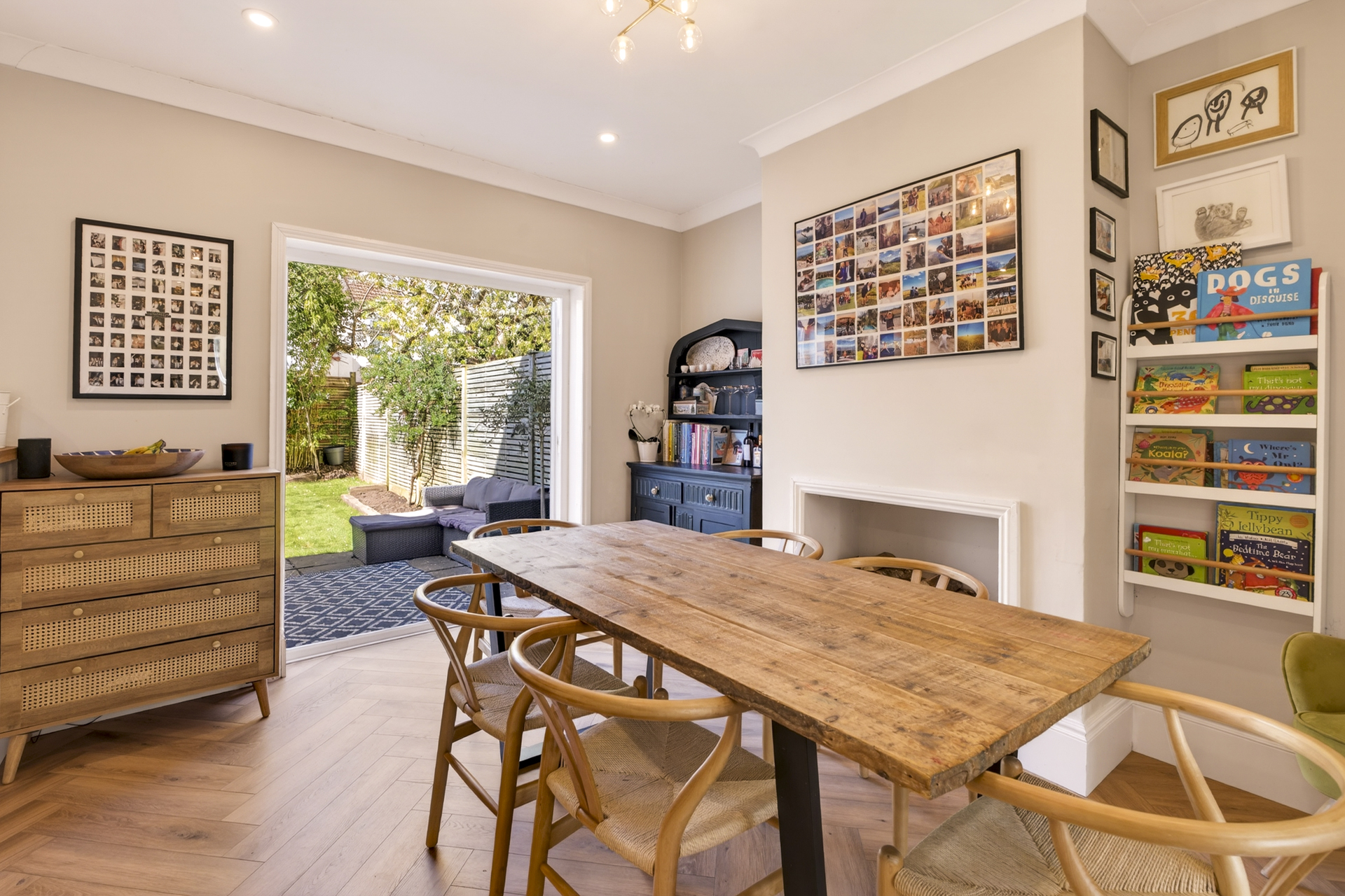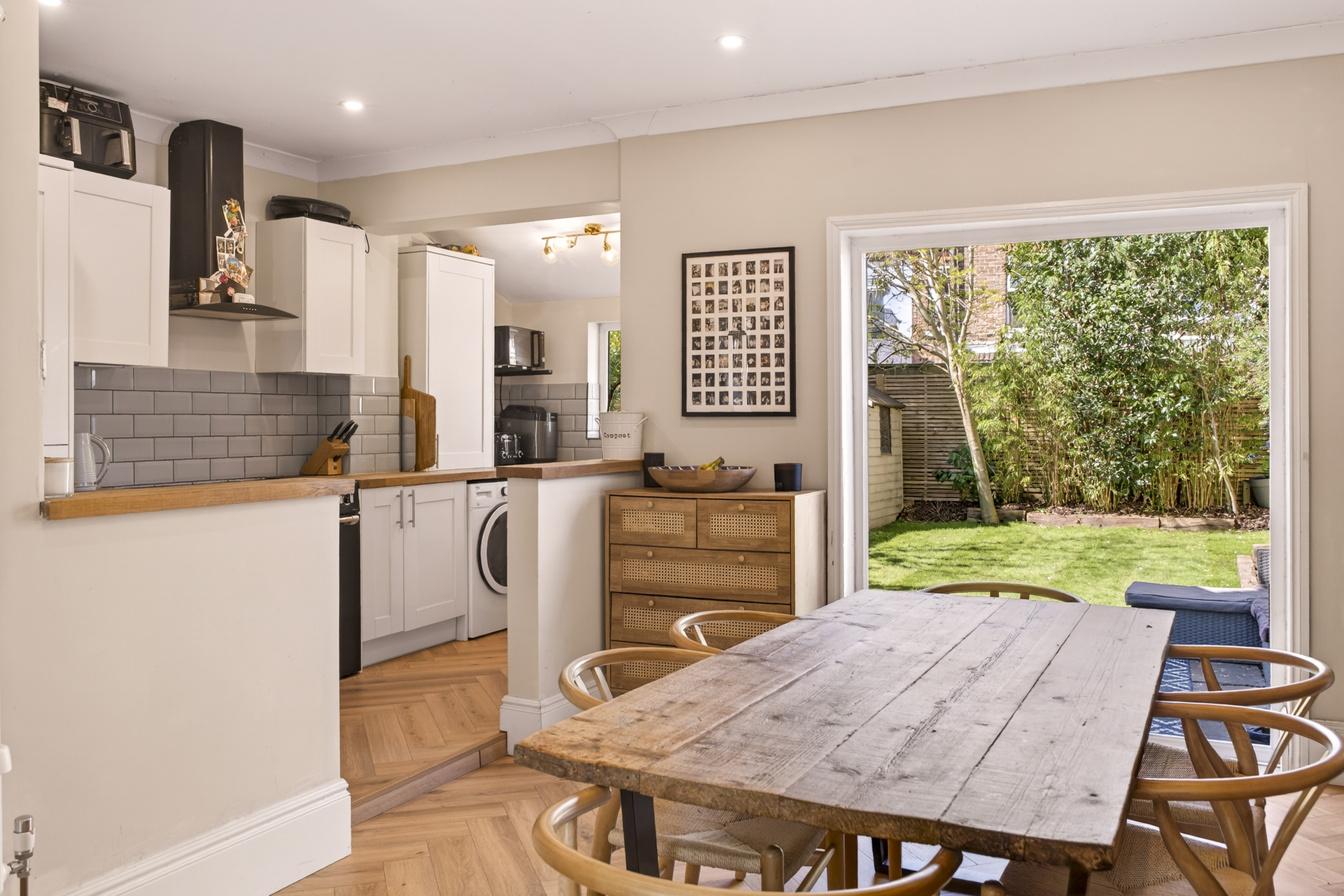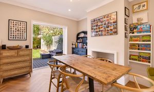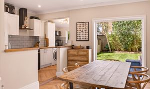The dining area opens out into the well-proportioned west-facing garden and patio, perfect for enjoying the evening sun. This garden feels incredibly quiet and private considering the convenient location of this home, thanks in part to clever planting and the layout of surrounding properties. Side access leads to the off-street parking area at the front of the house, a definite convenience for bikes, dogs and children.