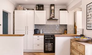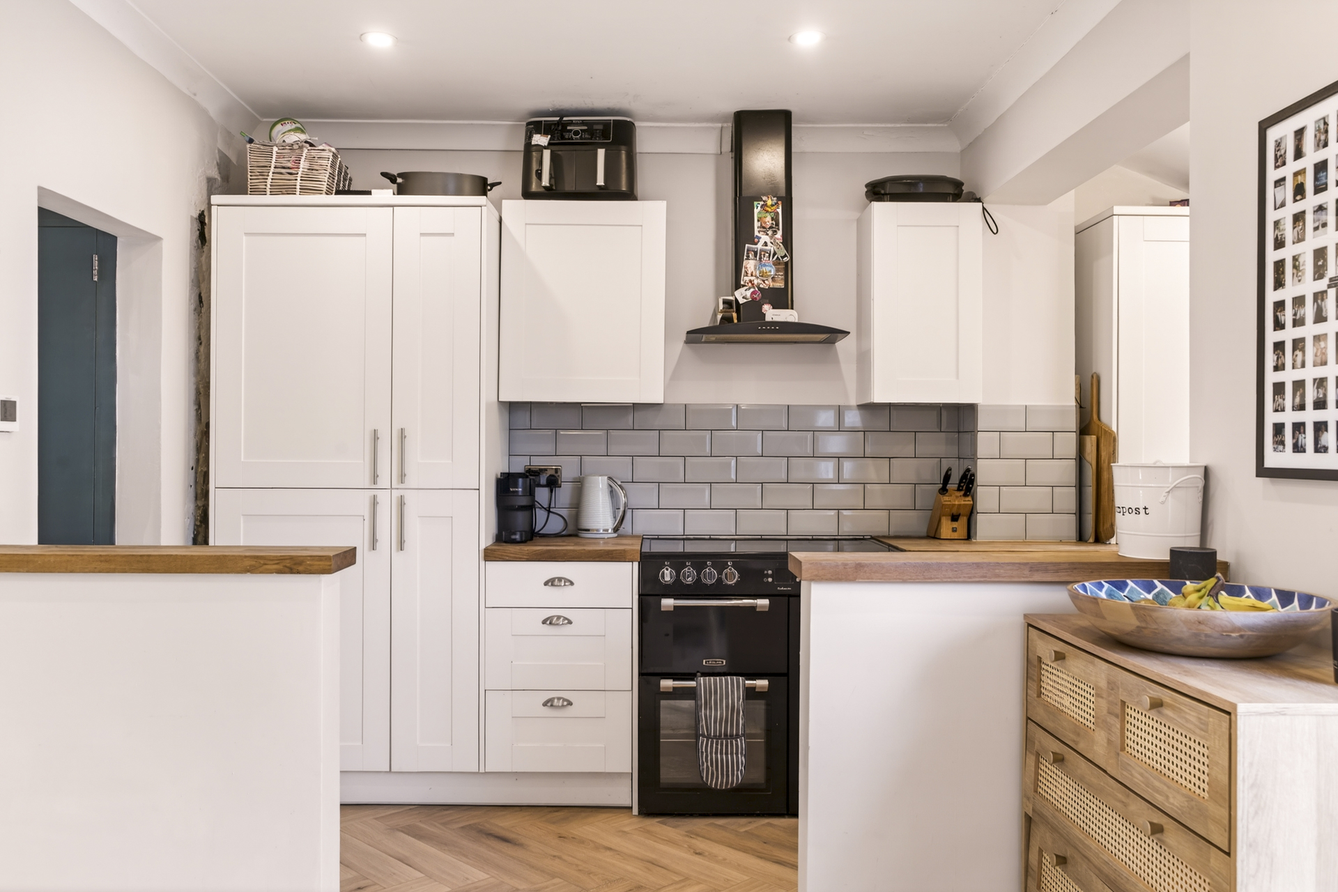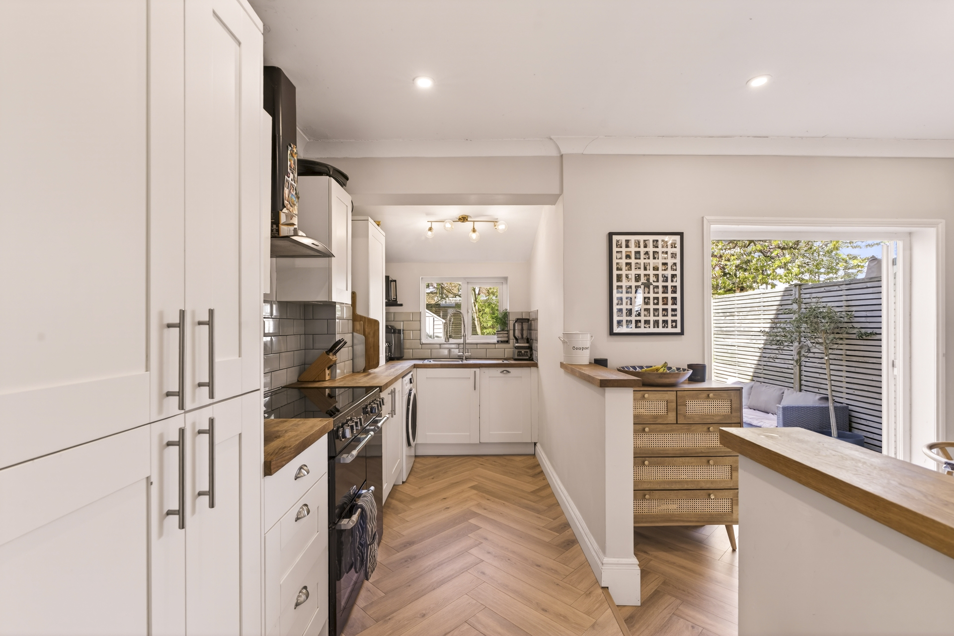 Semi-open plan kitchen with hardwood worktops overlooking the quiet back garden.