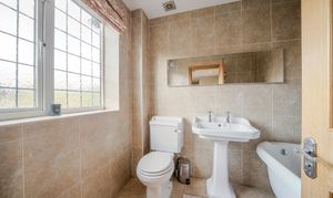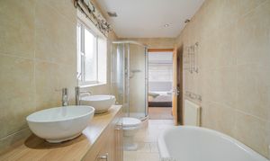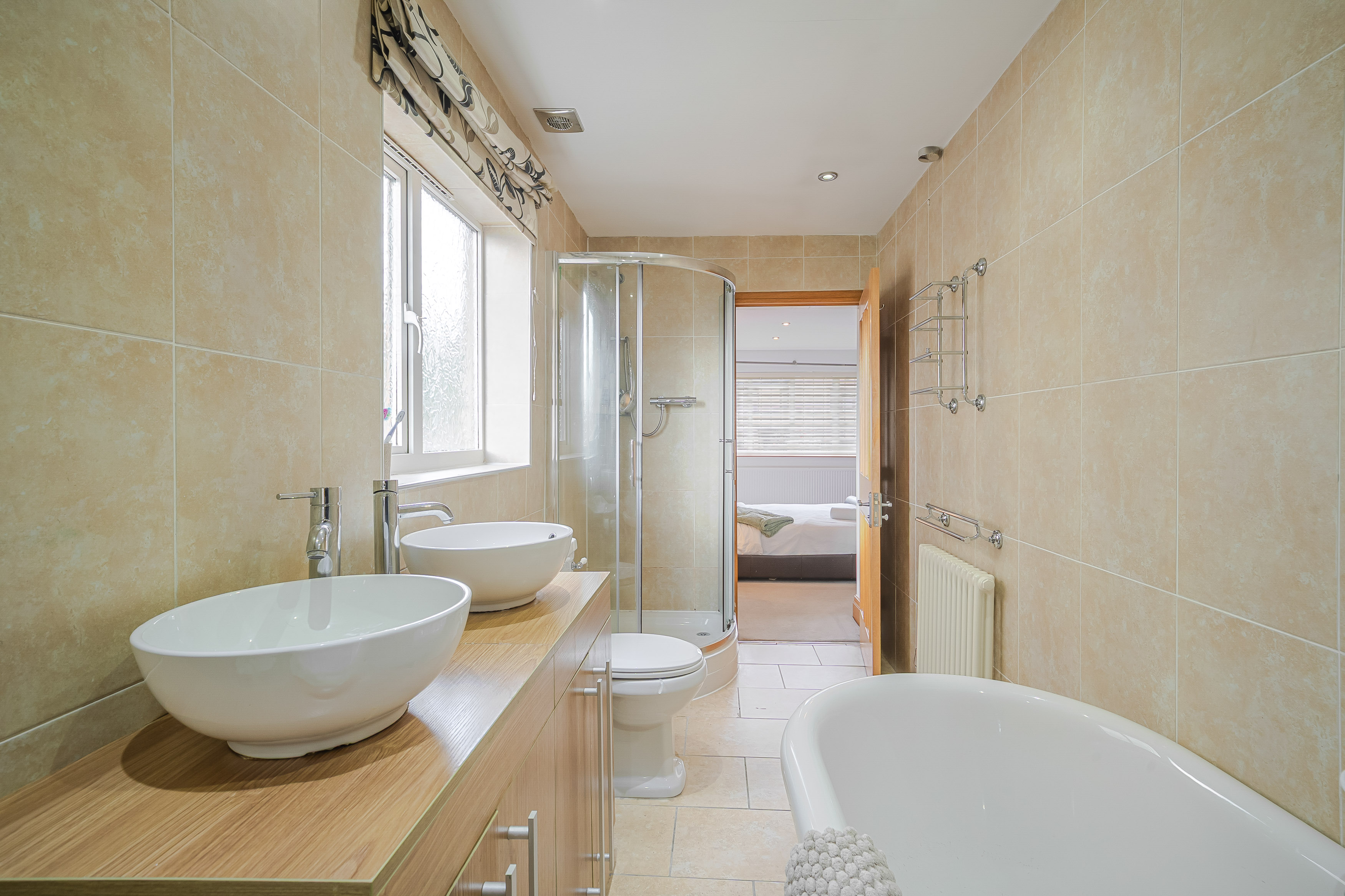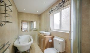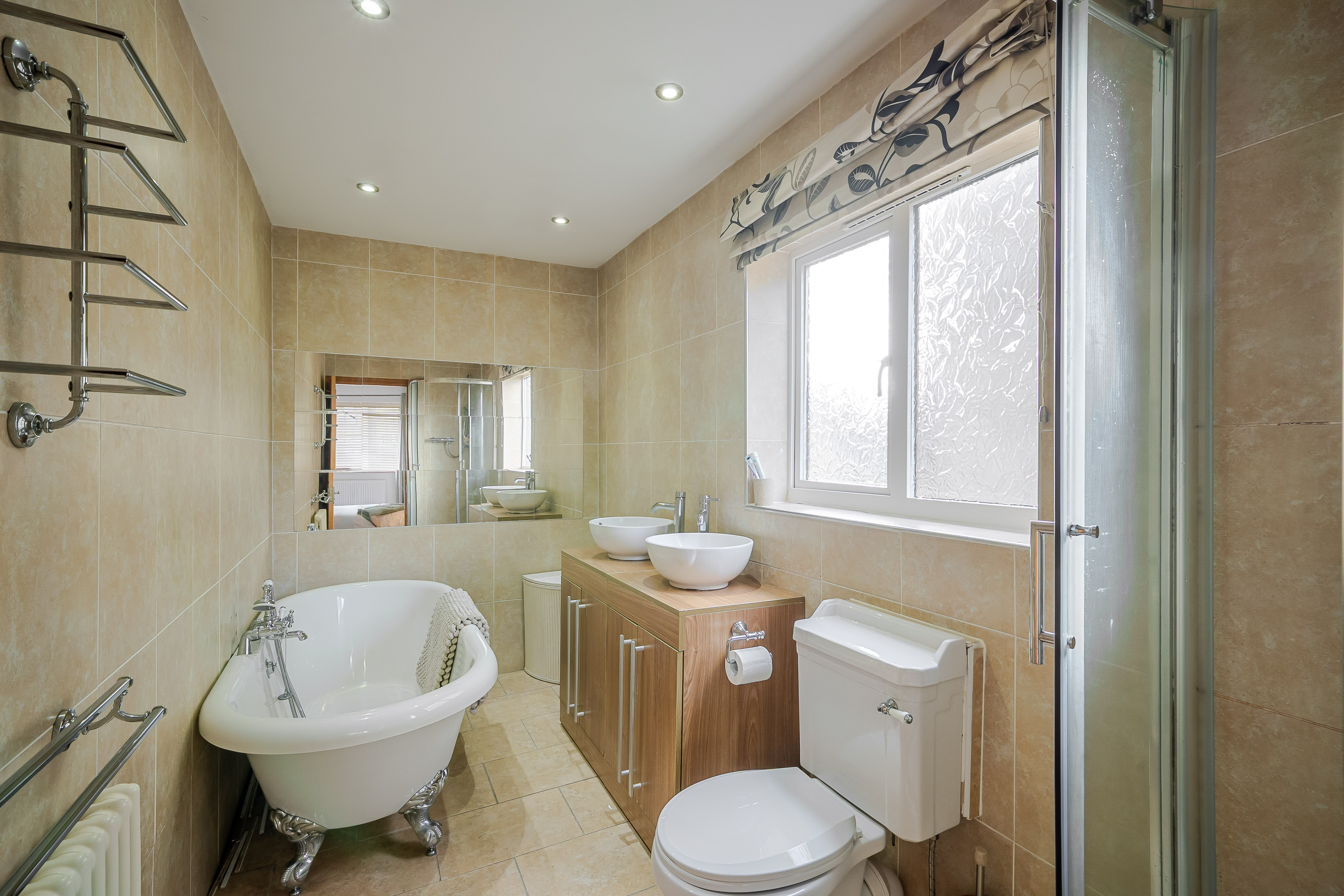 With LED downlighters, extractor fan, frosted pvcu double glazed window, column style radiator, floor to ceiling tiled walls with inset mirror, tiled floor and fitted with a suite comprising free standing roll top bath resting on ball and claw feet with a chrome mixer tap incorporating hand spray, twin circular hand wash basins with chrome monobloc taps resting on a vanity unit, low flush wc and corner shower cubicle with chrome shower fitting.