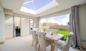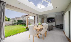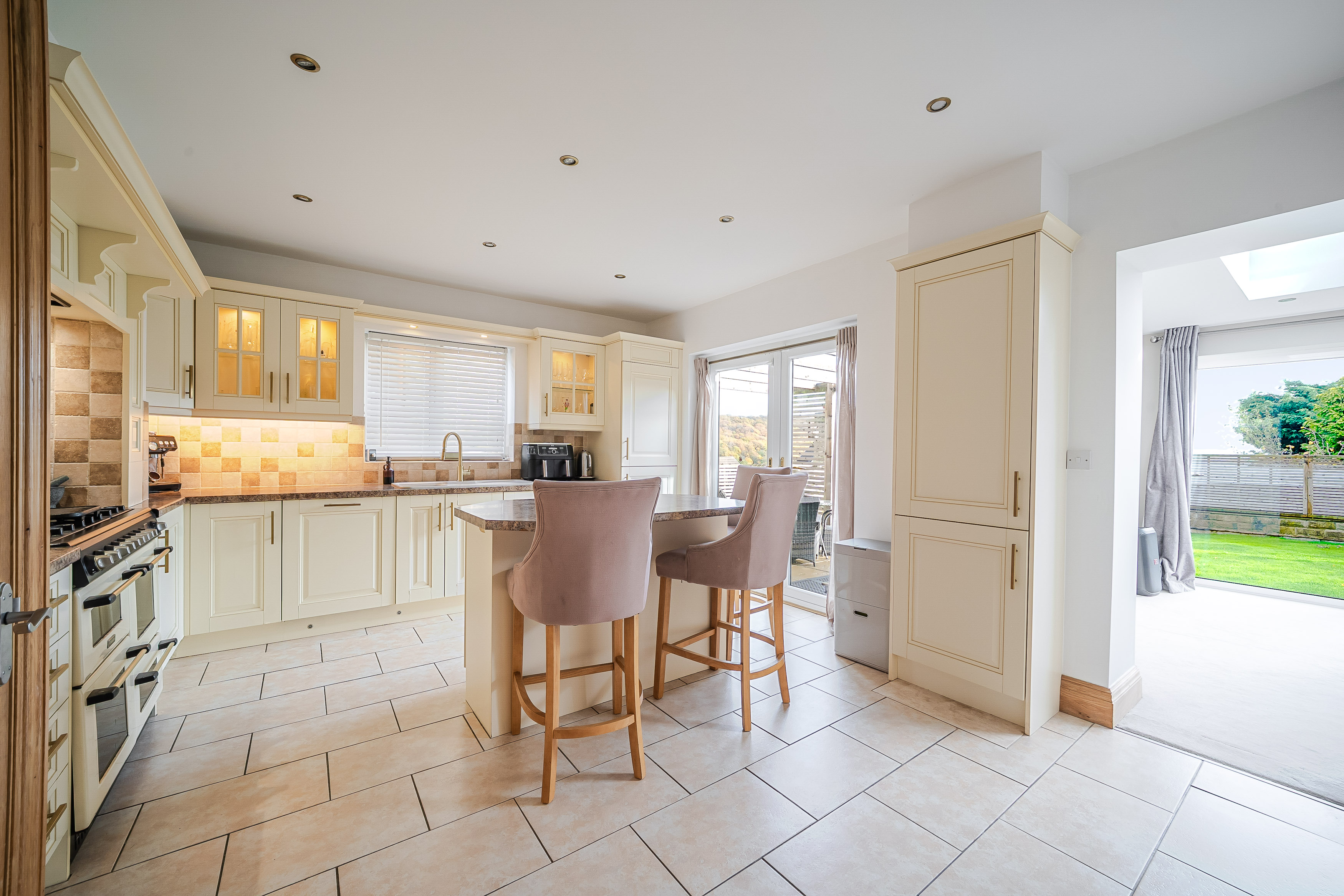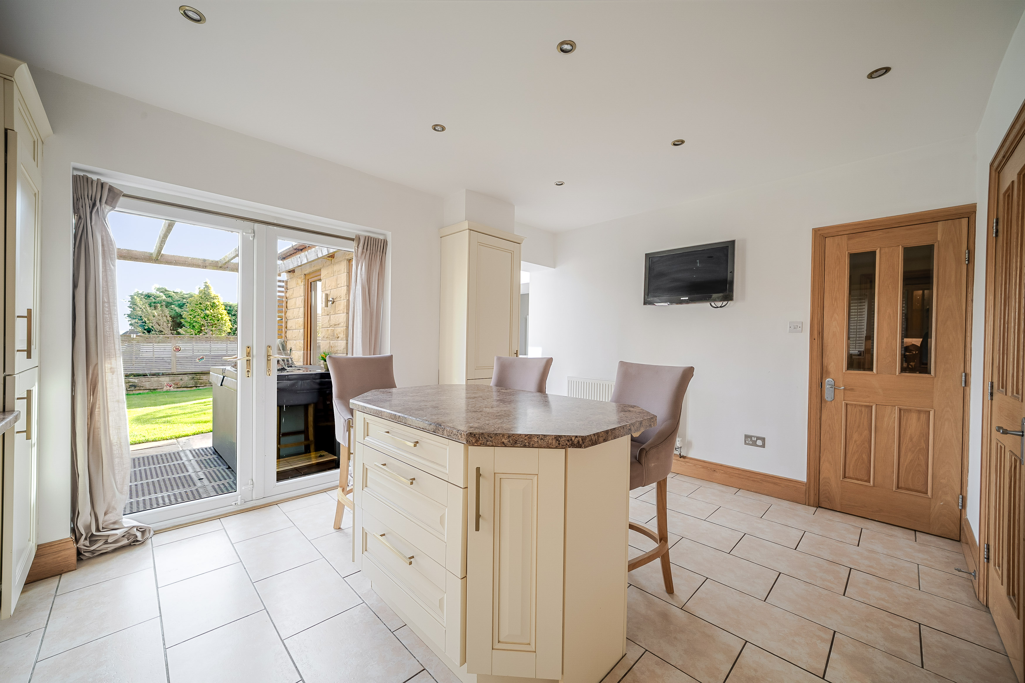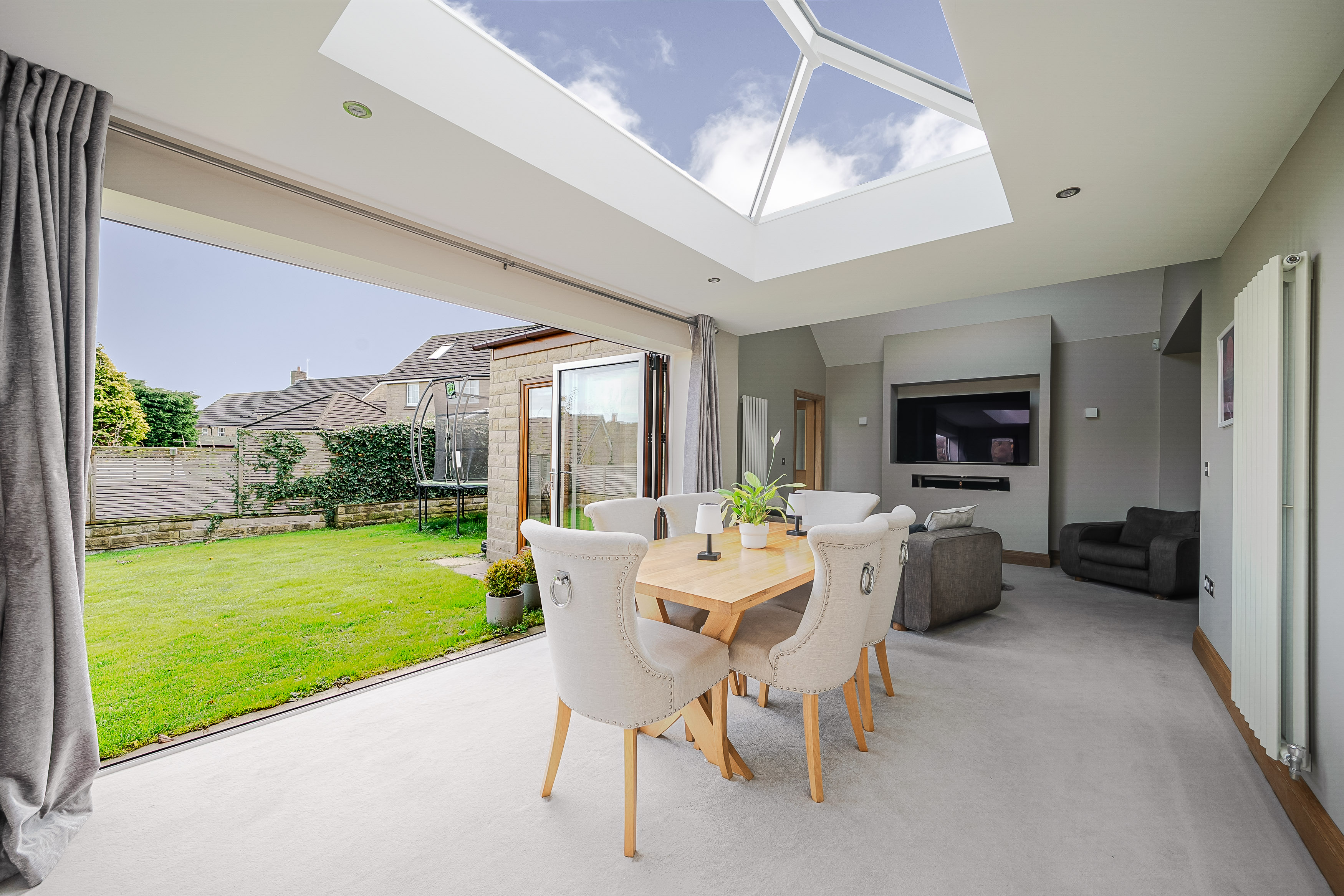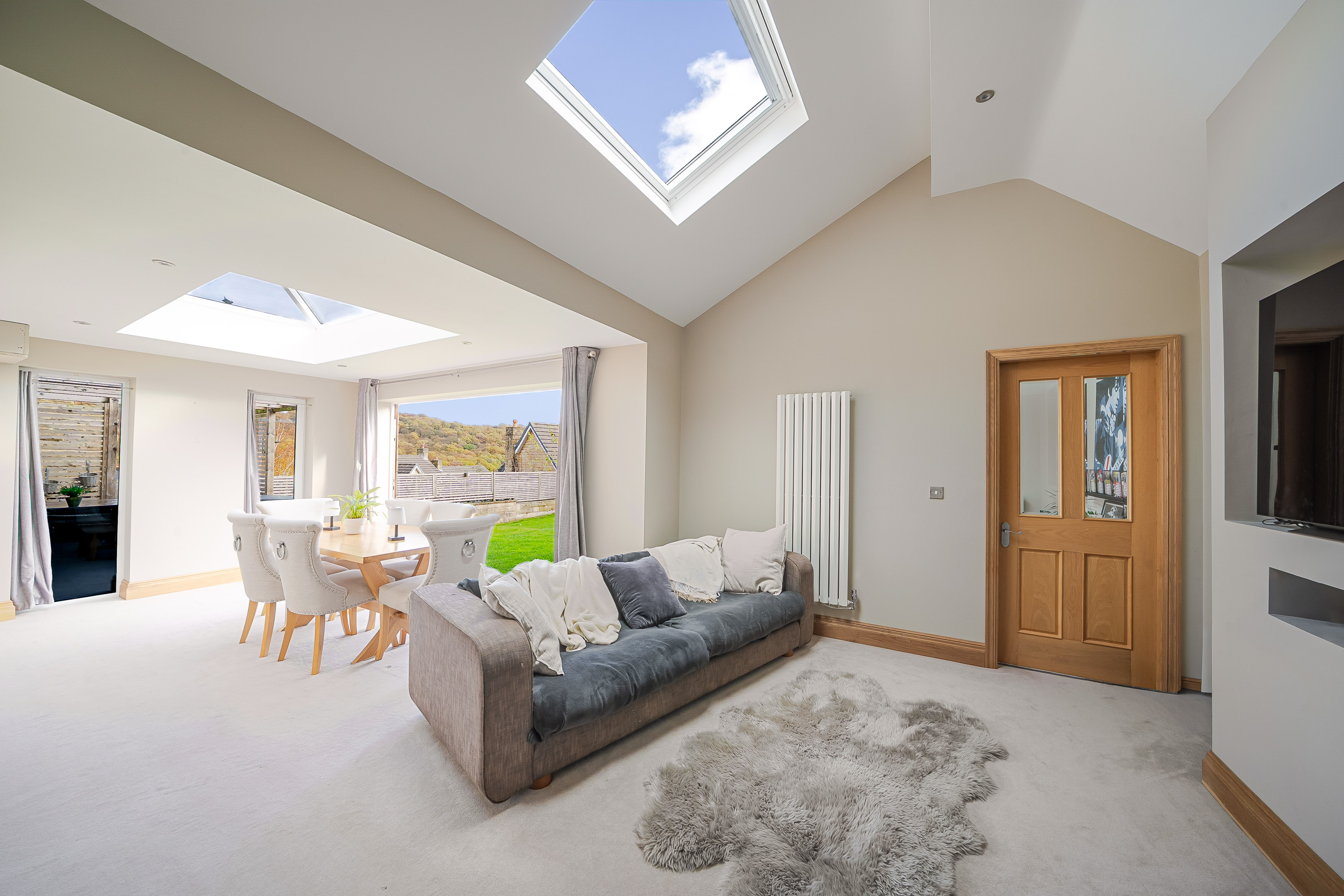 This forms a part of the extension which includes a sitting area and study. The dining area has glazed atrium with inset ceiling downlighters, there are two tall pvcu double glazed windows to the side elevations and three section bifold doors to the rear all of which provide the room with an abundance of natural light as well as taking advantage of some far-reaching views over Huddersfield and across to Grimscar woods to one side.