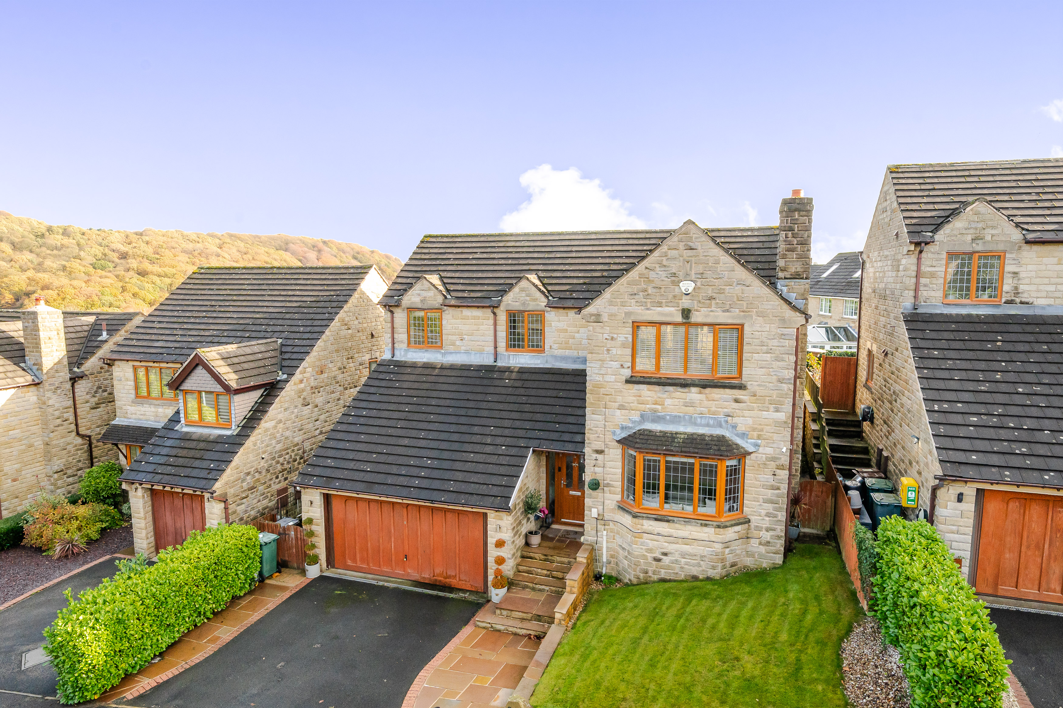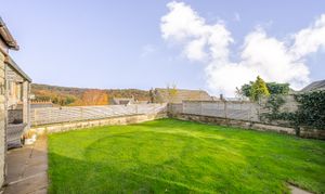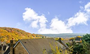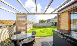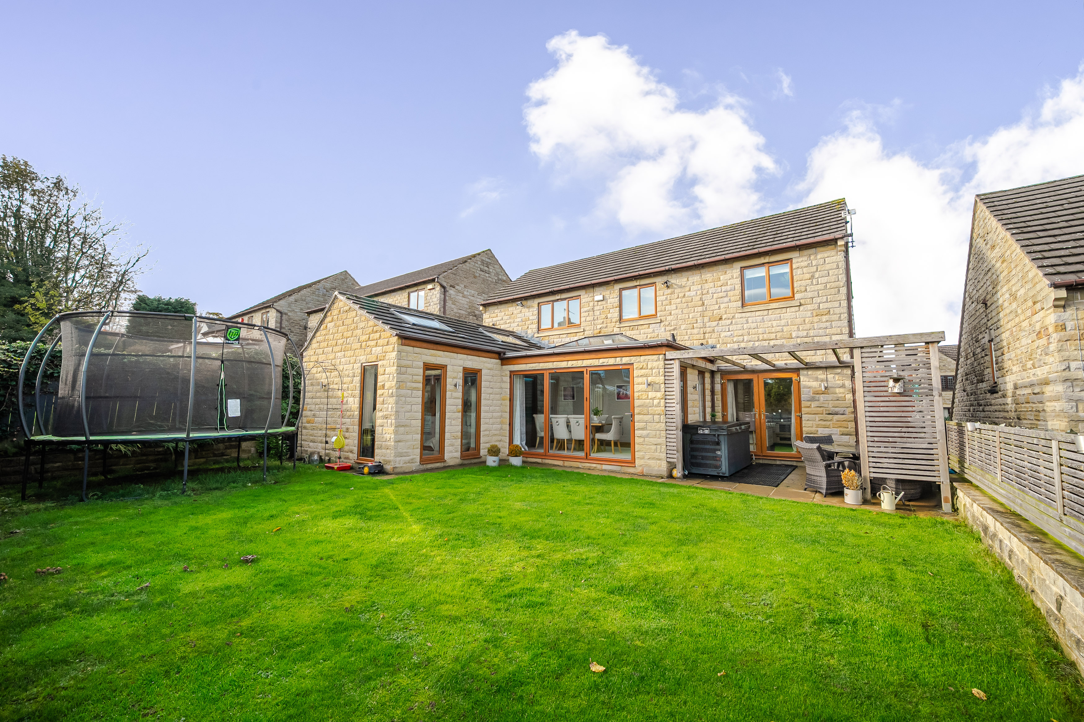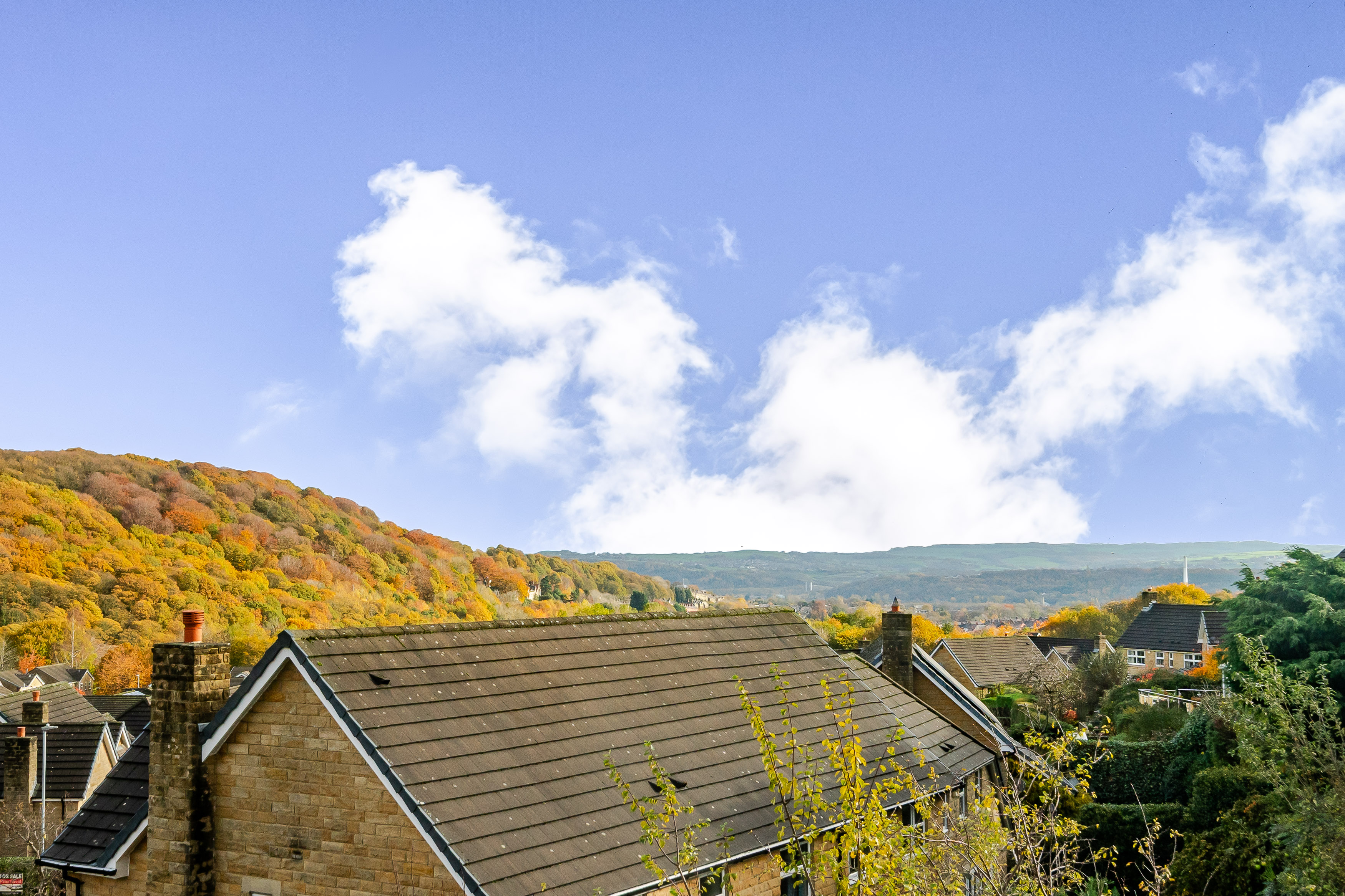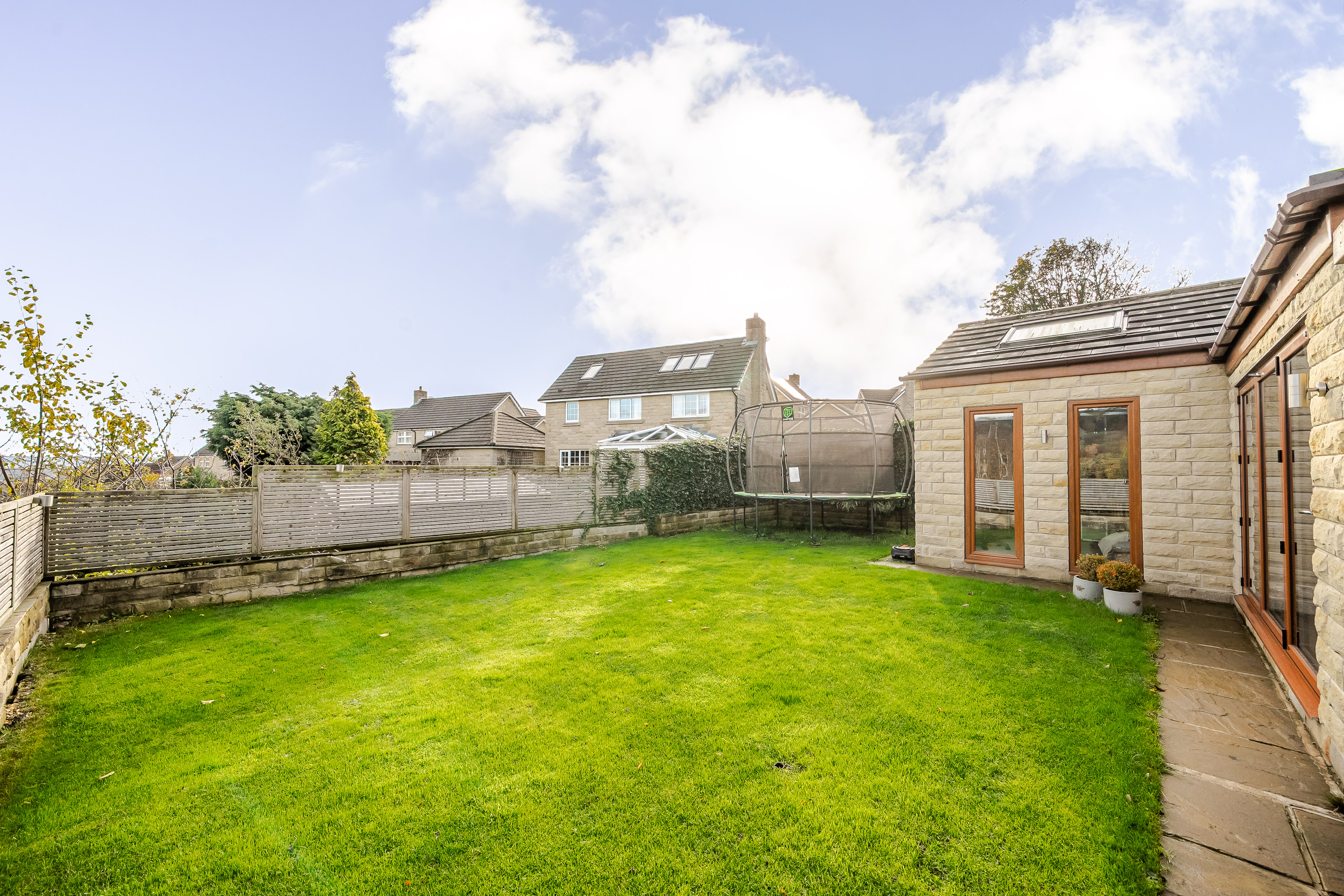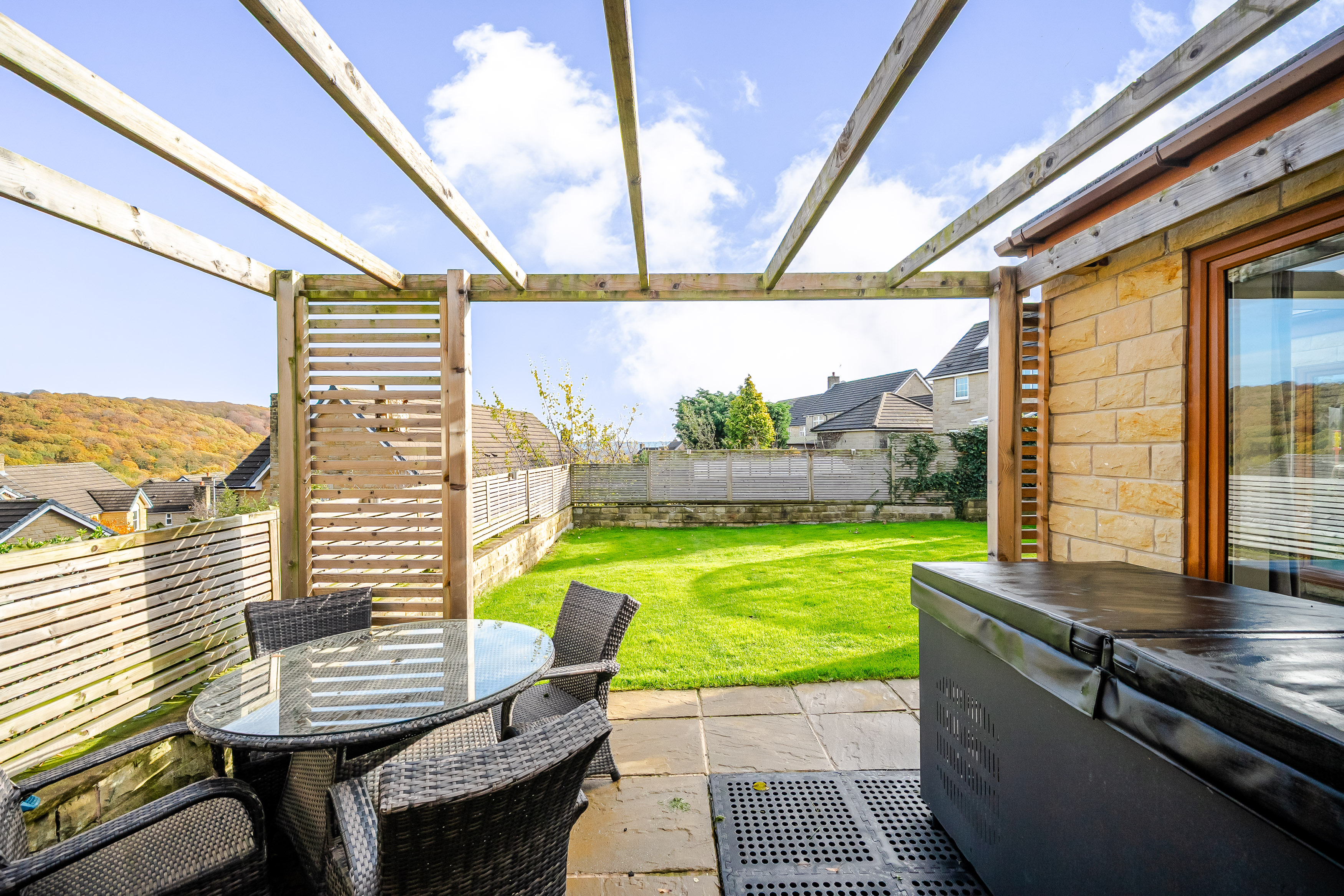 With flagged patio which can be accessed through French doors in the kitchen this has a timber pagoda and views to one side stretching across to Grimscar woods. Beyond this there is a lawned garden together with flagged pathway and wall and timber fencing to the borders and once again having views over Huddersfield and Grimscar woods to one side.