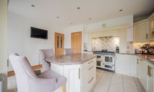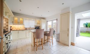 There are inset LED downlighters, an oak panelled door which gives access to a useful pantry, the kitchen has a central heating radiator, tiled floor and fitted with a range of ivory shaker style base and wall cupboards, drawers, these are complimented by contrasting overlying worktops with tiled splashbacks, glazed display cupboards with glass shelving and downlighters, pelmet downlighters, concealed lighting beneath the wall cupboards, wine rack, inset one and half bowl single drainer sink with a brass effect monobloc tap, range style cannon gas cooker with six burner gas hob, twin oven and grill with extractor hood over, integrated fridge, integrated freezer, integrated dishwasher and island unit with drawer, pan drawers, cupboards and once again having contrasting overlying worktop which extends to form a breakfast bar.