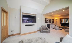 As the dimensions indicate this is another generously proportioned room which as stated earlier is open plan to the dining area and has an oak panelled and bevelled glass door to one side giving access to the hallway. There are two vertically hung radiators, inset LED downlighters, Velux double glazed window, two wall light points and to one side there is media unit which has housing for a flat screen tv up to 70 inches and below this there is a recess for a sound bar.