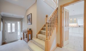 This has a composite panelled and frosted double glazed door with oak flooring to the initial section together with central heating radiator and three steps rising to the main hallway which has inset LED downlighters and to one side a spindled staircase rises to the first floor. From the hallway access can be gained to the following rooms: -