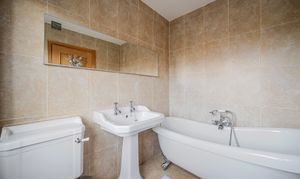With frosted pvcu double glazed window, inset LED downlighters, extractor fan, floor to ceiling tiled walls, tiled floor, chrome ladder style heated towel rail fitted with a suite comprising roll top slipper style bath resting on ball and claw feet with chrome mixer tap incorporating hand spray, pedestal wash basin and low flush wc.
