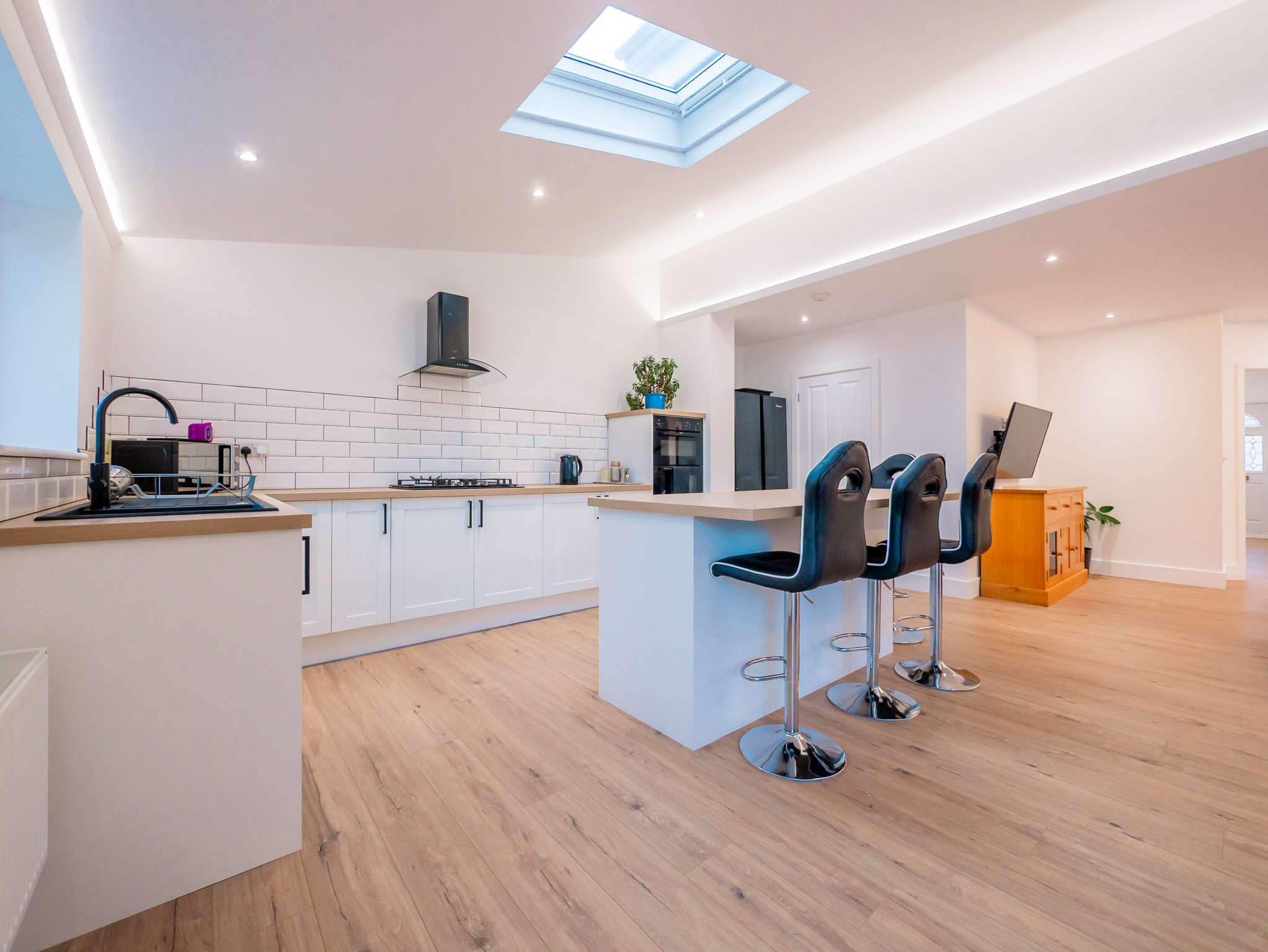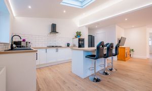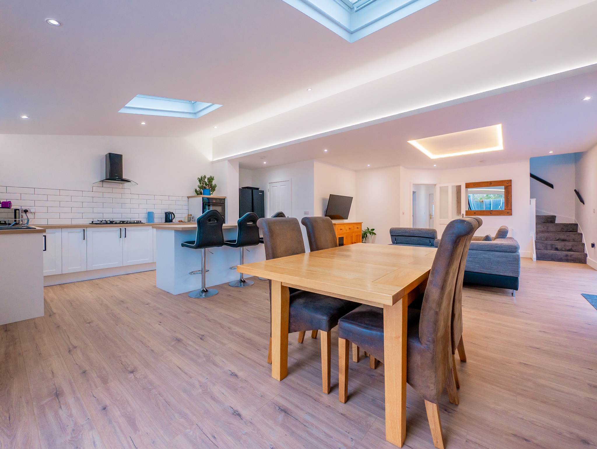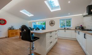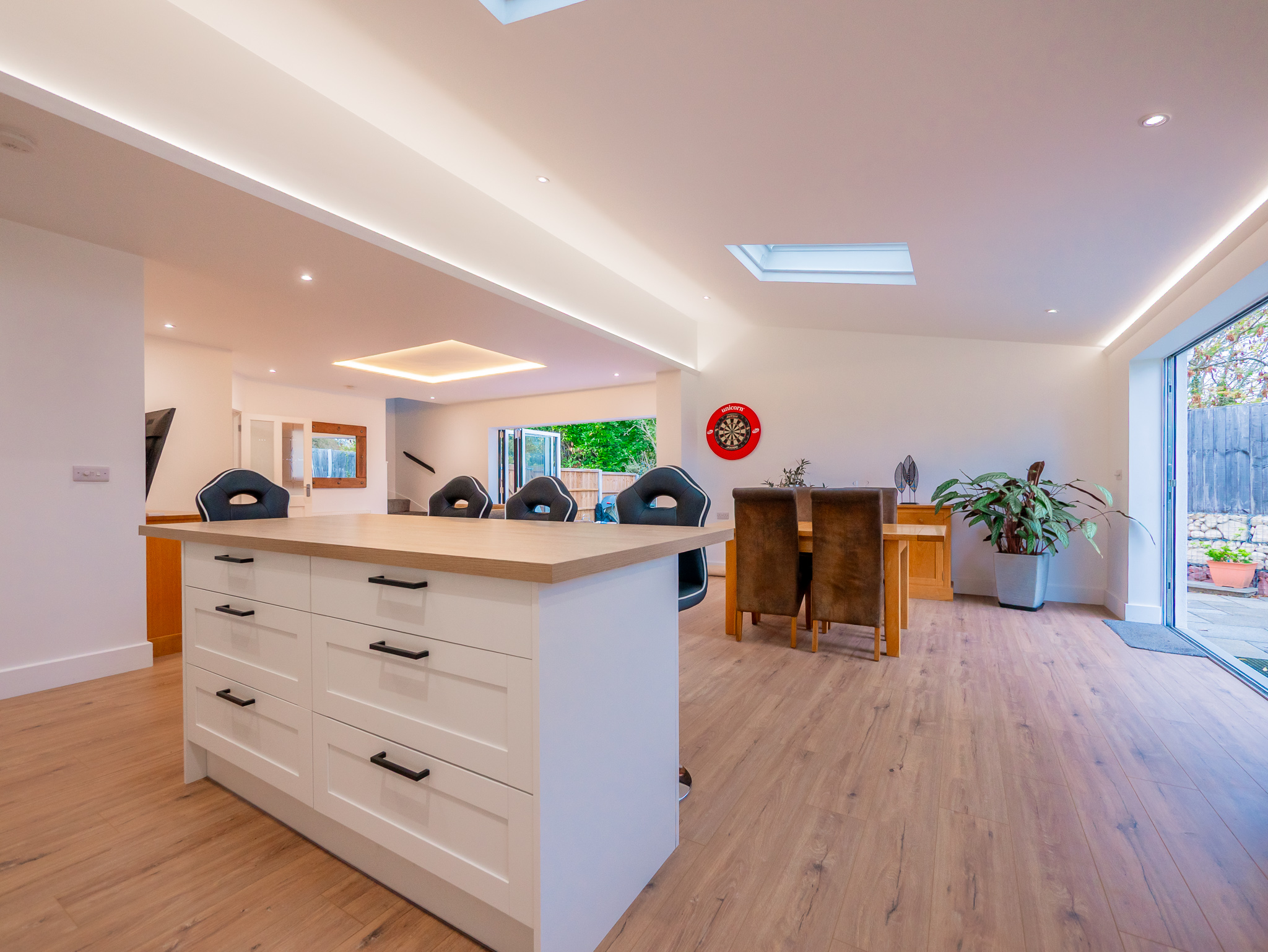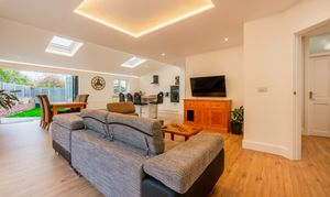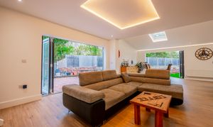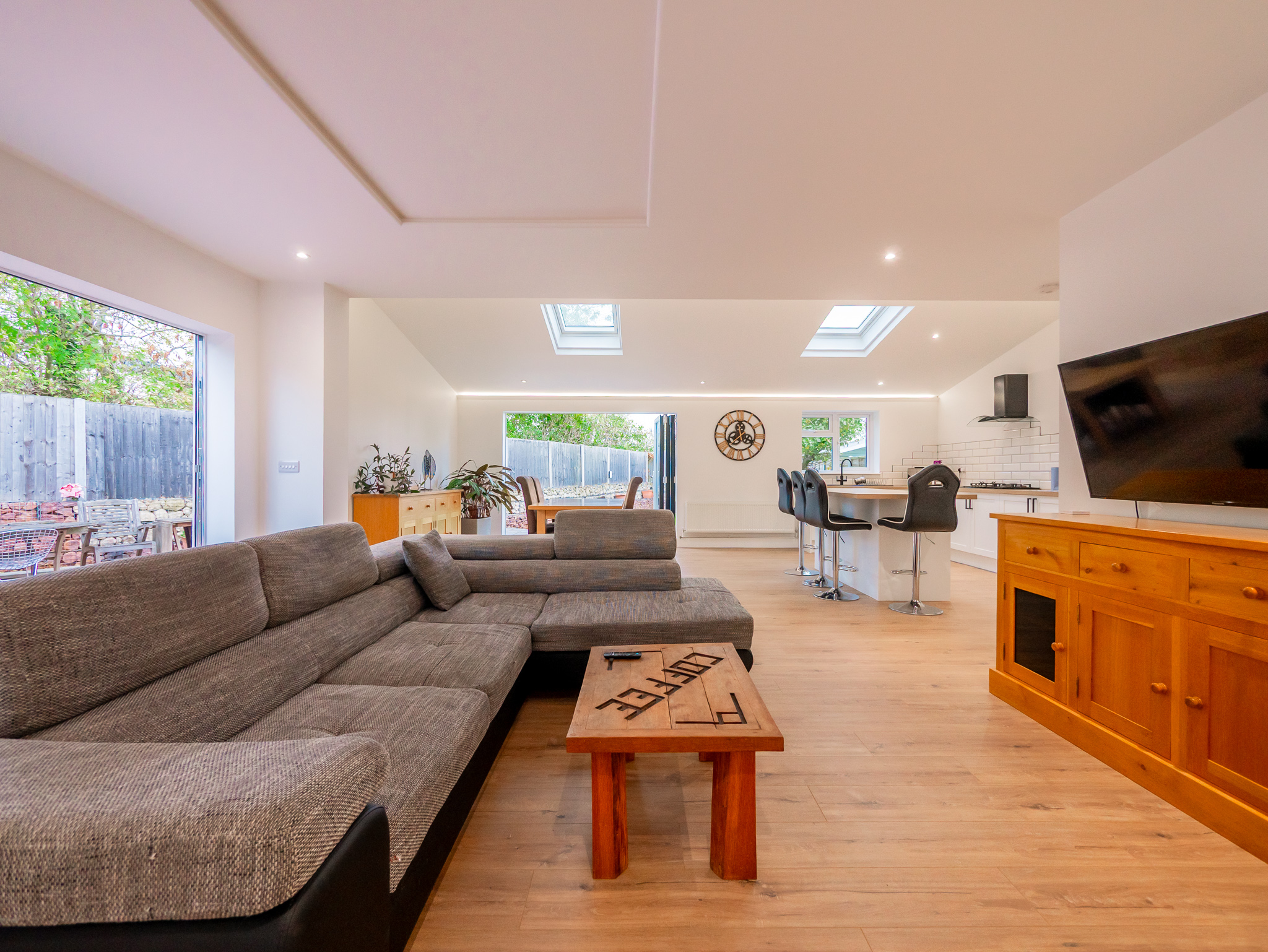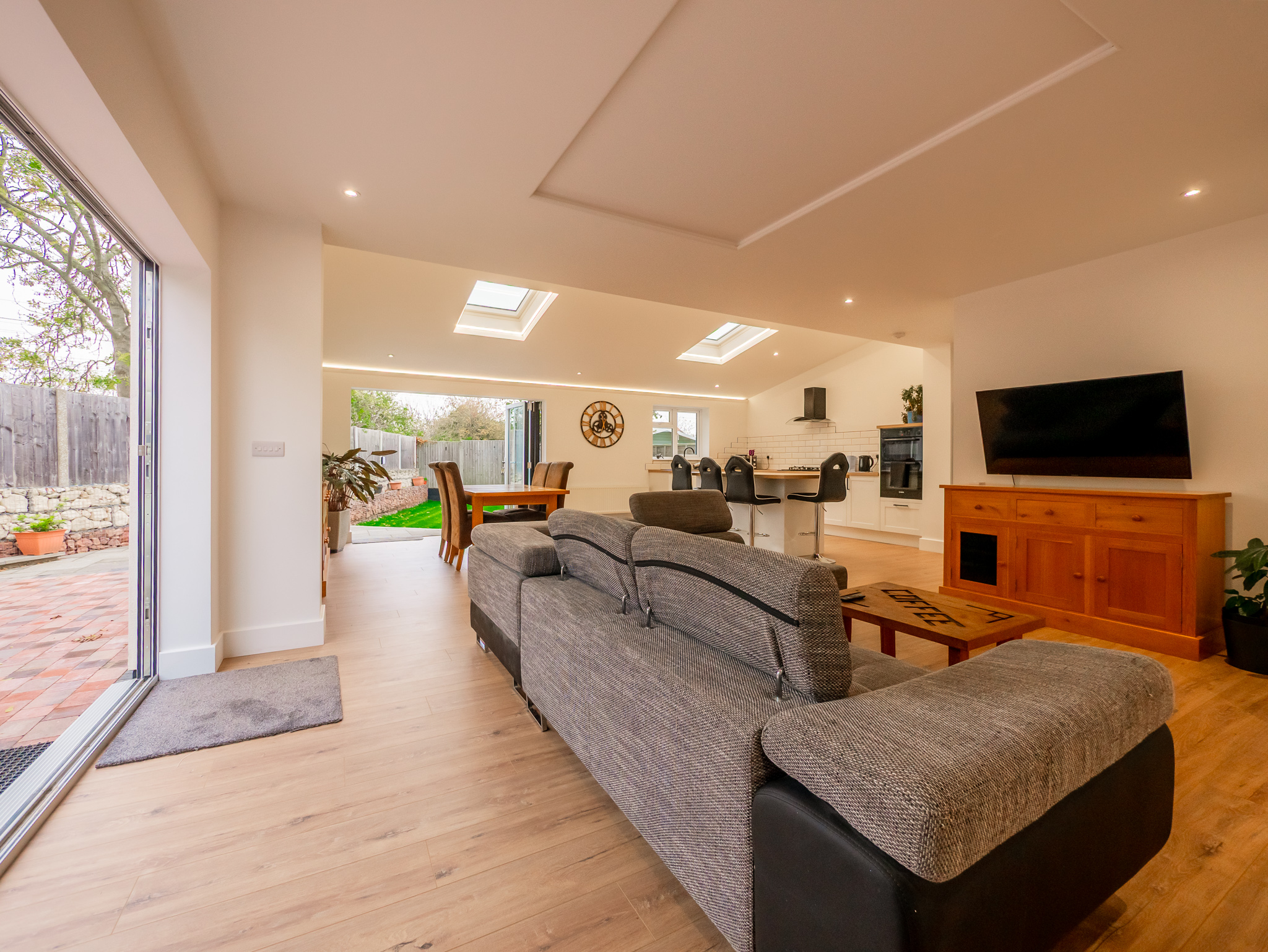 - Huge Open Plan Kitchen/Lounge/Dining Room with Bi Fold Doors to 2 Sides and Coffered Ceiling Lighting