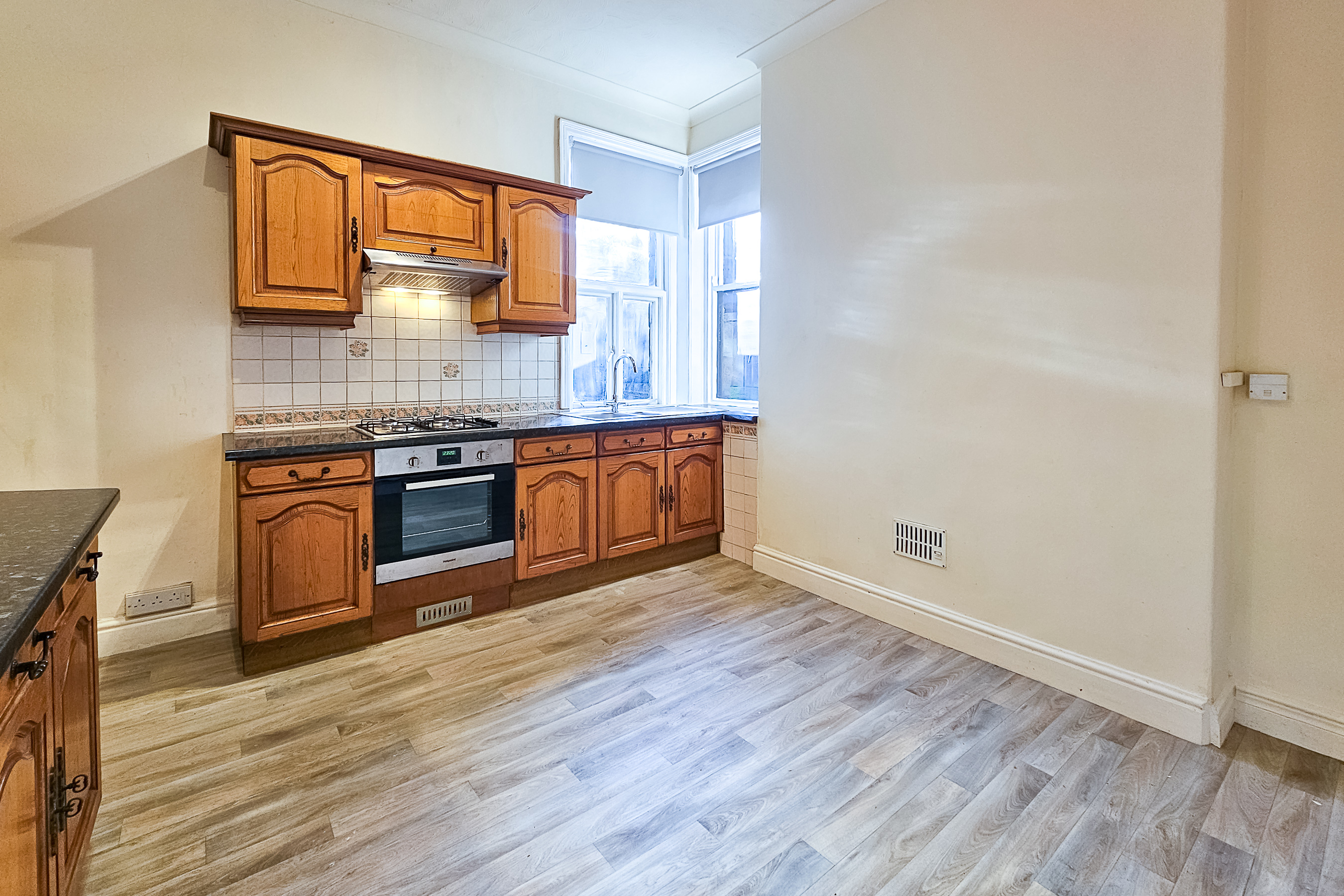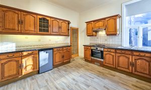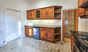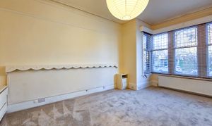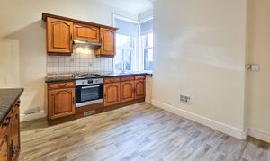 Inside, the layout is generous and well designed. The large kitchen/diner offers extensive fitted cabinetry, a modern oven and hob, and plenty of space for a dining table. Natural light fills the room through a tall window, highlighting the high ceilings and creating a bright, welcoming atmosphere. The lounge sits to the rear of the property and provides a peaceful retreat with direct access toward the private garden, ideal for relaxing or entertaining.
