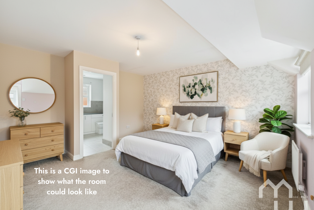 Master Bedroom with electric fireplace. En-suite. Fitted Wardrobes. Lounge area area. Bay window. Windows to front.