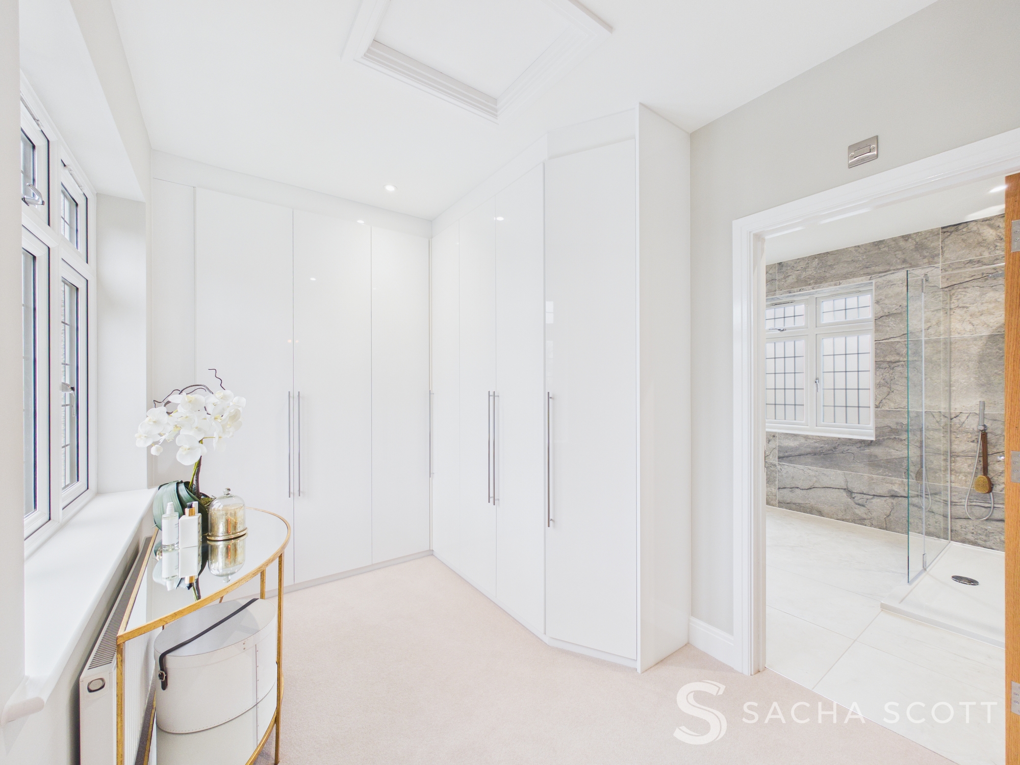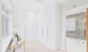 This well appointed dressing room provides excellent storage with a range of full height built in wardrobes, thoughtfully designed with internal lighting and integrated drawers for practical organisation. The space is heated by a radiator and also provides access to the loft hatch. From here, a door leads directly through to the en-suite bathroom, creating a well planned and practical flow from the primary bedroom.