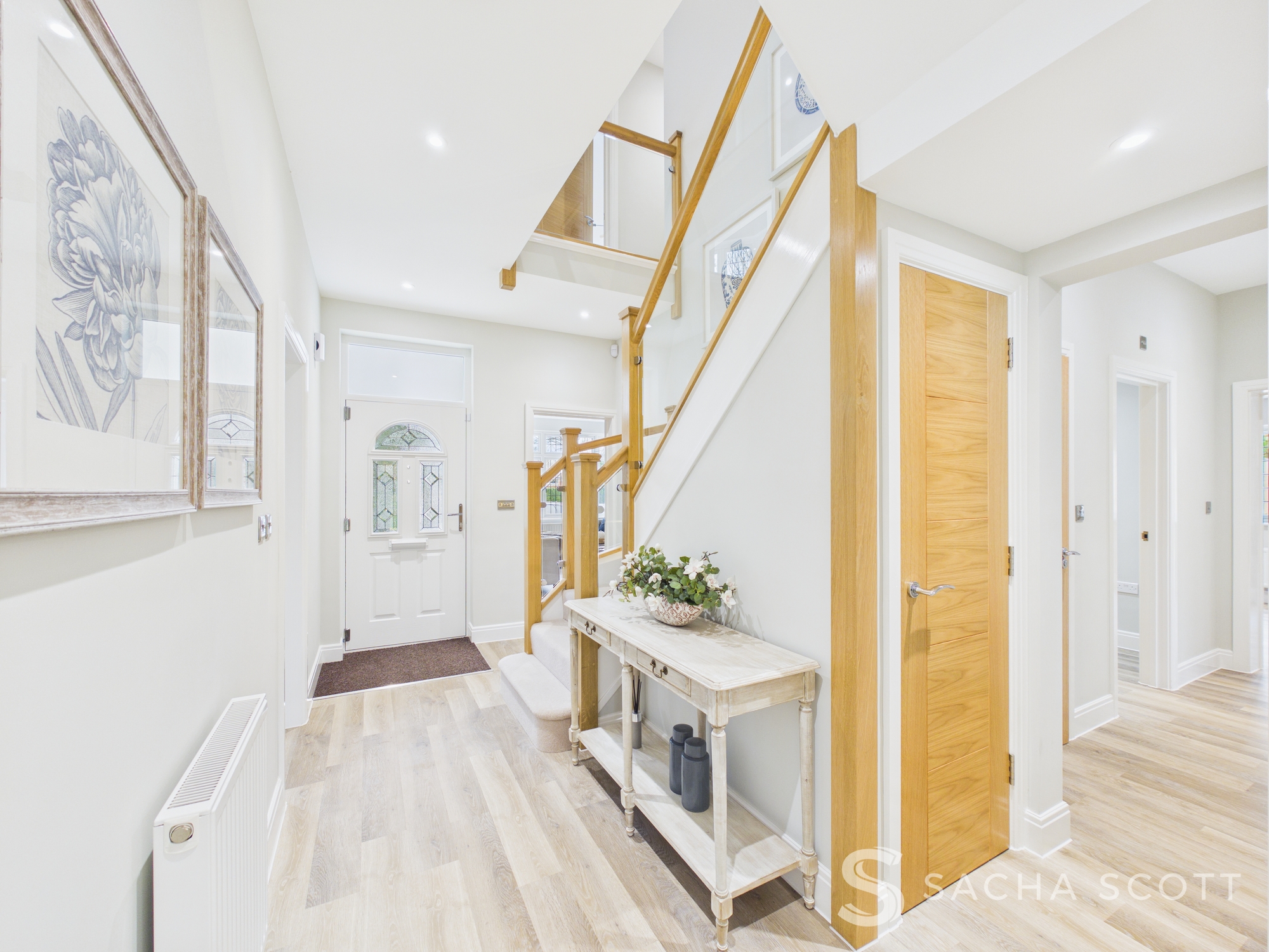 The entrance hall is an impressive and welcoming space that really sets the tone for the rest of this impressive family home. Finished in warm oatmeal tones with Karndean flooring underfoot, it feels bright, spacious and beautifully presented. A turning staircase with wood and glass balustrades rises from the hall, adding a stylish focal point without overpowering the space. There is plenty of room for a console table and the layout works well. It is a lovely, open entrance that gives an immediate sense of the quality and space this home offers.