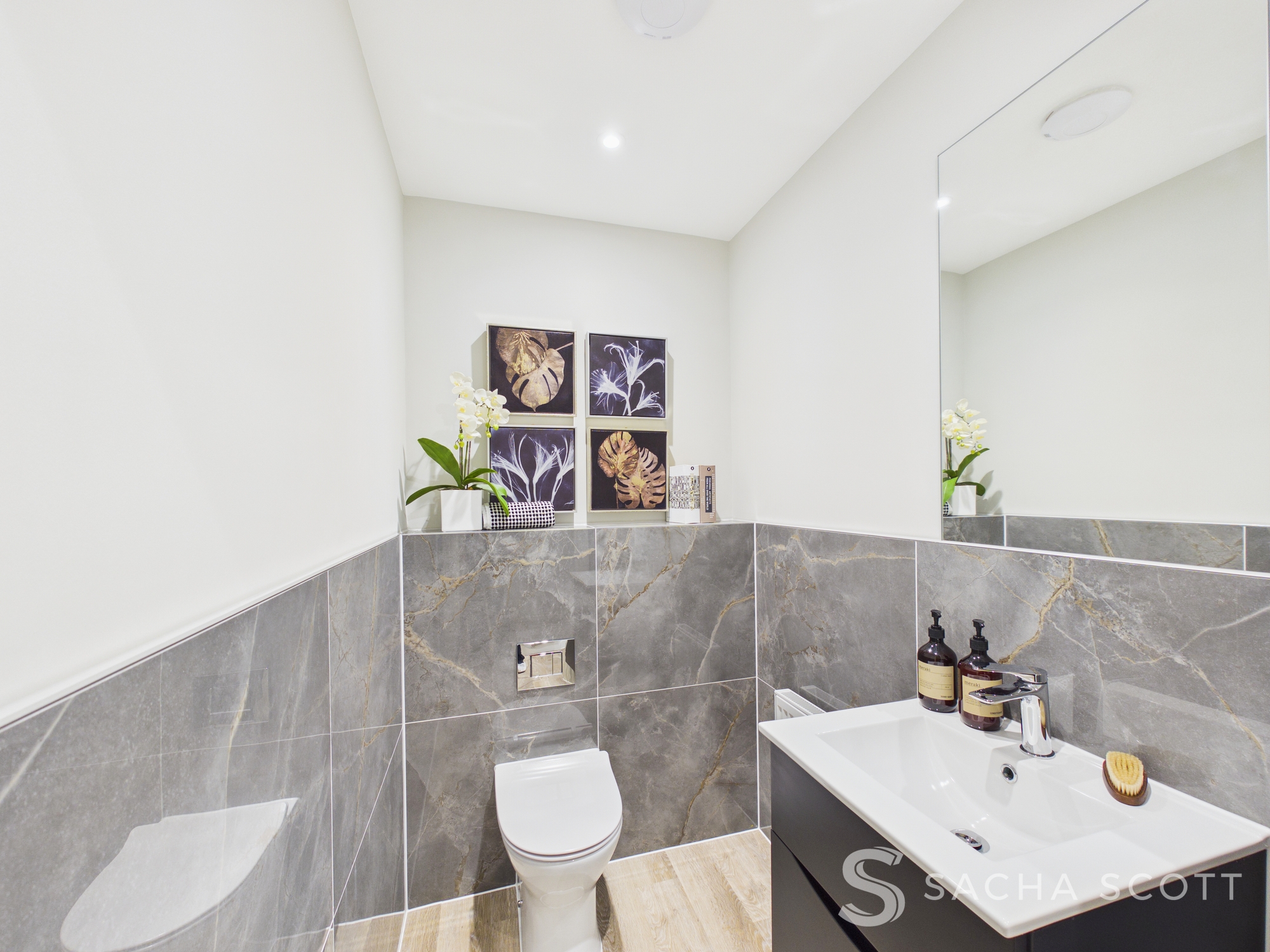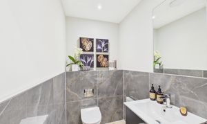 The downstairs WC is conveniently located off the main entrance hall, close to the utility room. Part tiled with distinctive patterned tiles, the space has a stylish and contemporary feel. It features a vanity sink with drawer storage, a mirror and a WC, creating a practical and well presented guest cloakroom.