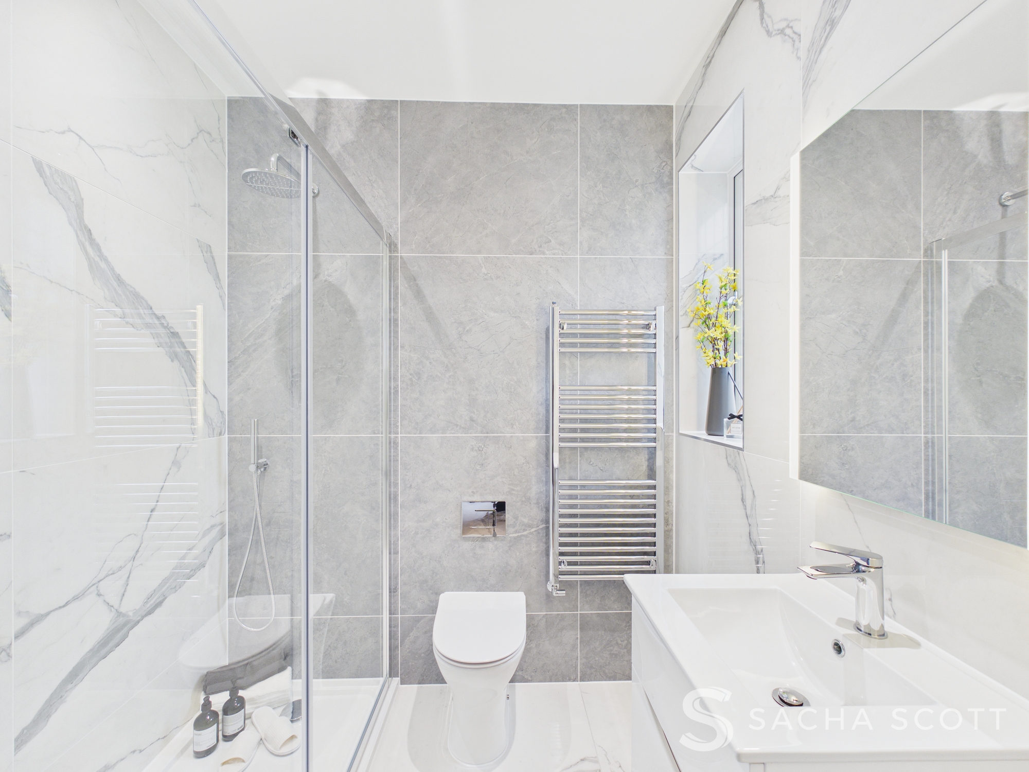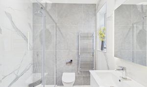 The en suite to this bedroom is fully tiled in white and grey, creating a clean and contemporary finish. It offers a large shower enclosure, WC and sink, along with a heated towel rail for added comfort. A window provides natural light and ventilation, completing this well appointed bathroom space.