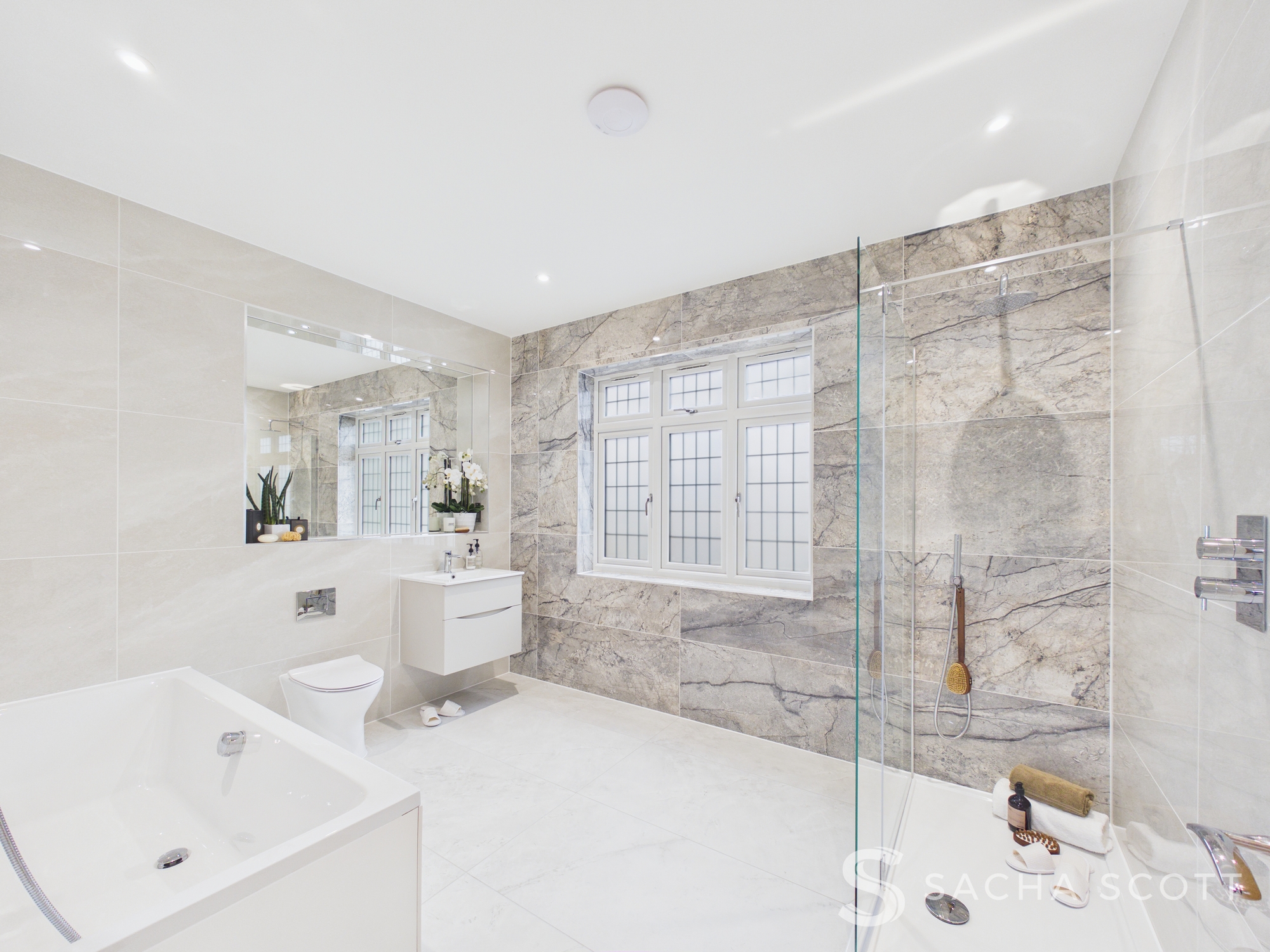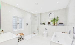 The family bathroom is exceptionally spacious and finished with floor to ceiling tiling in a warm grey tone, giving the room a stylish and contemporary feel. It features a large shower enclosure, separate bath, WC and sink, with a window providing natural light and ventilation. With plenty of floor space between the fittings, the room feels open, comfortable and well designed for everyday family use.