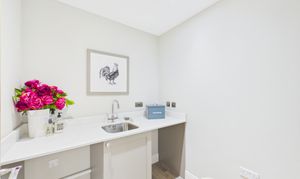 Located off of the entrance hall, opposite the kitchen, this handy utility room is neutrally presented and offers a sink, storage and room for both a washing machine and tumble dryer.
