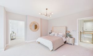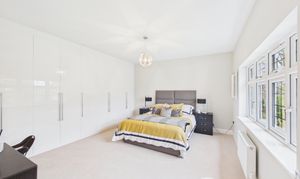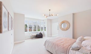 This impressive primary bedroom is a wonderfully generous space featuring a beautiful bay window that fills the room with natural light. Finished in neutral decor and heated by radiators, the room offers a calm and comfortable setting with excellent proportions. The layout has been thoughtfully arranged so that additional storage furniture is not required, as the bedroom is served by a dedicated dressing room, which provides extensive wardrobe space and leads on to the en-suite bathroom.