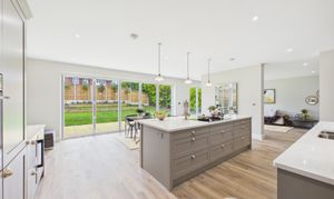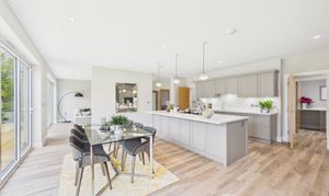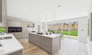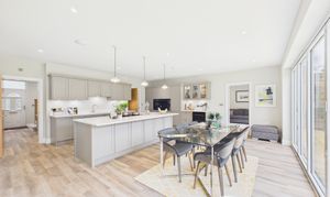 Accessed from the main hallway via two entry points, this superb kitchen and dining space forms the true heart of the home. Finished to a high standard, it features a large central island with excellent storage, premium cabinetry and integrated appliances. The layout easily accommodates a generous dining area, while bi-fold doors open onto the garden, bringing in plenty of natural light and creating a seamless indoor outdoor feel. Underfloor heating adds comfort throughout the space. A separate utility room is accessed off of the hallway from one side of the kitchen, while an office/ playroom sits just off the dining area, offering useful flexibility for modern family living. This is a beautifully designed kitchen/diner space, ideal for both everyday life and entertaining.