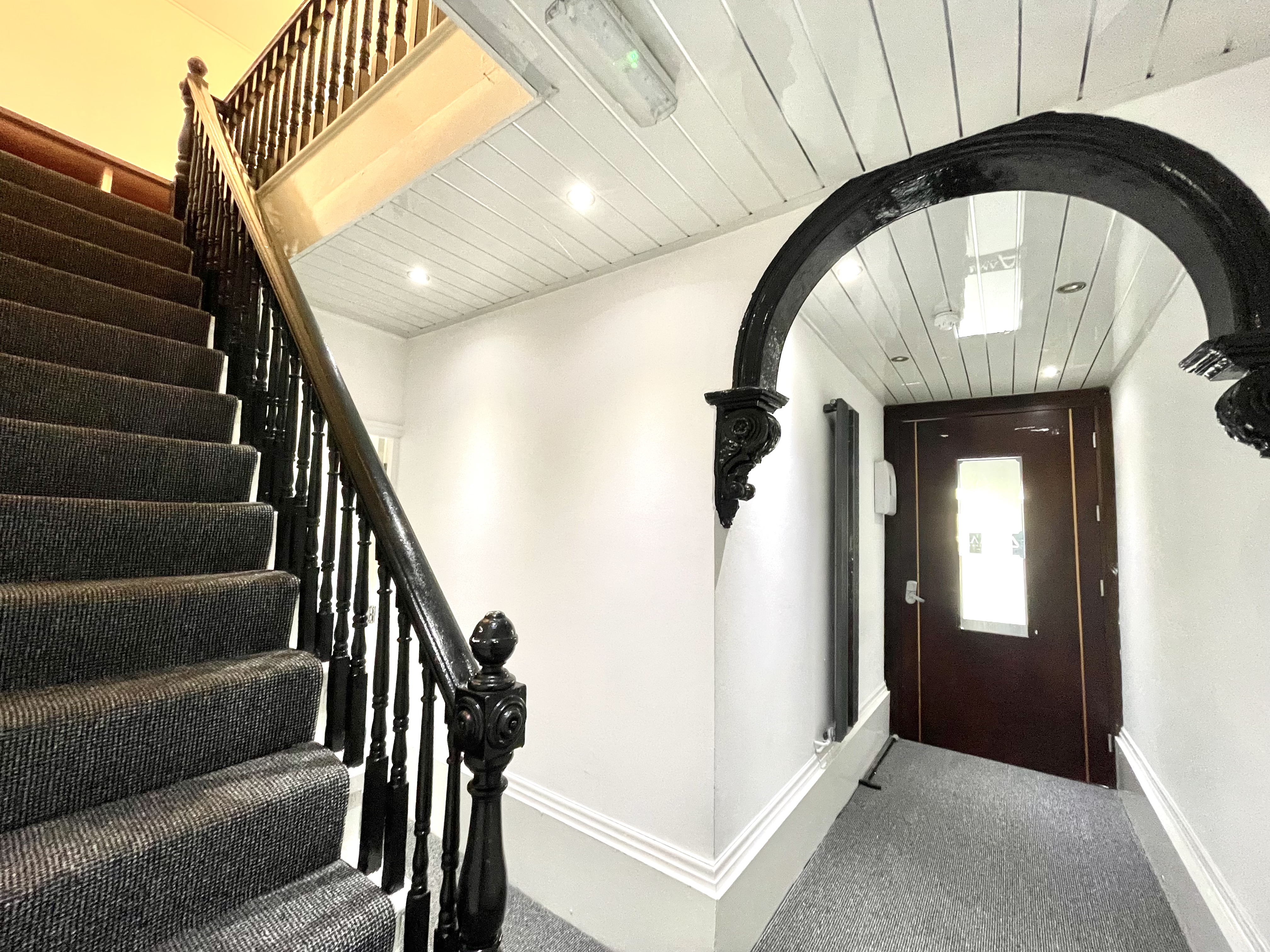 This is L shaped with a feature arch part way down, there are inset LED downlighters, vertically hung radiator and to one side a spindle staircase rises to the first floor.