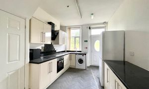 This can also be accessed from the hallway and has pVCU double glazed window looking out over the rear garden with an adjacent pVCU and frosted double glazed door. There is a ceiling light point and fitted with a range of cream gloss base and wall units, drawers, contrasting overlying worktops with tiled splashbacks, four ring halogen hob, electric oven, extractor fan, single drainer stainless steel sink, plumbing for automatic washing machine and space for fridge freezer. To one side a door gives access to the basement.