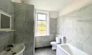 With window, ceiling light point, majority tiled walls and fitted with a suite comprising low flush w.c., bidet, pedestal wash basin and panelled bath with chrome shower fitting incorporating fixed shower rose and separate hand spray.