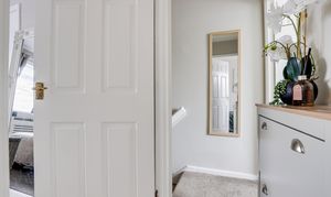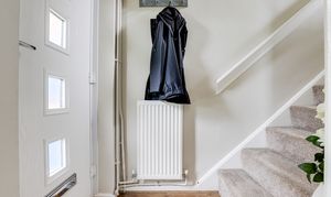 The entrance hall has wood-effect flooring, carpeted stairs, a radiator, and a single composite door providing access into the accommodation.
