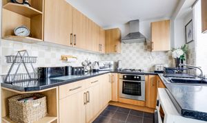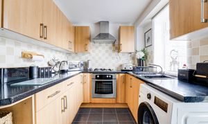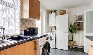 The kitchen has a range of fitted base and wall units with rolled-edge worktops, a stainless steel sink and a half with a neck mixer tap and drainer, an integrated oven and hob with a stainless steel extractor fan, space and plumbing for a washing machine, space for a fridge freezer, laminate flooring, partially tiled walls, a radiator, a wall-mounted boiler, a UPVC double-glazed window to the rear elevation, and a UPVC door leading into the conservatory.