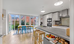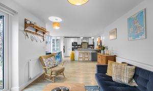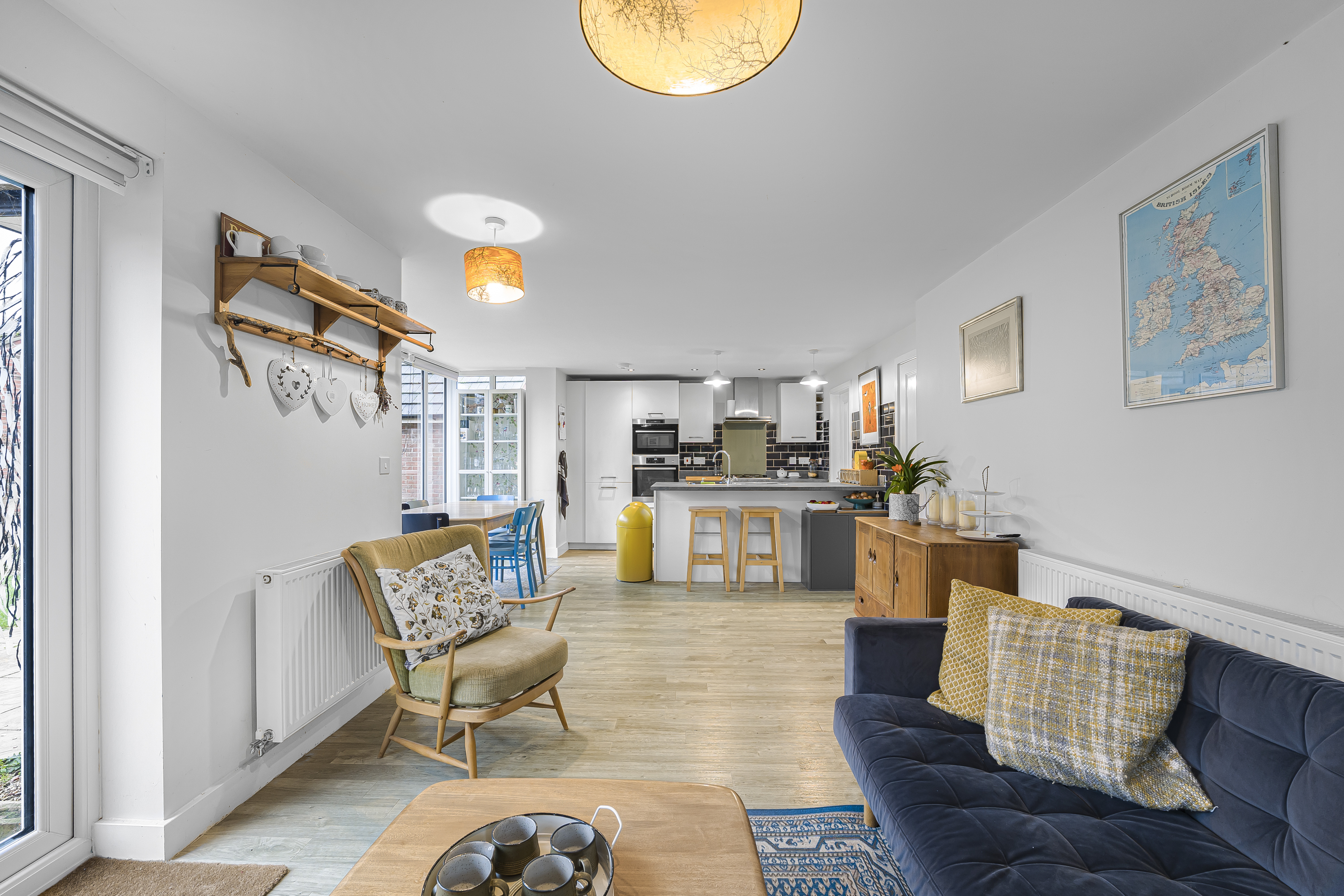 A spacious and sociable area fitted with a range of wall and base units, complementary worktops, stainless steel sink, integrated appliances including oven, microwave, dishwasher, fridge freezer, and gas hob with extractor. Dual aspect windows provide plenty of natural light, with French door access leading out to the rear garden. Two radiators complete the space.