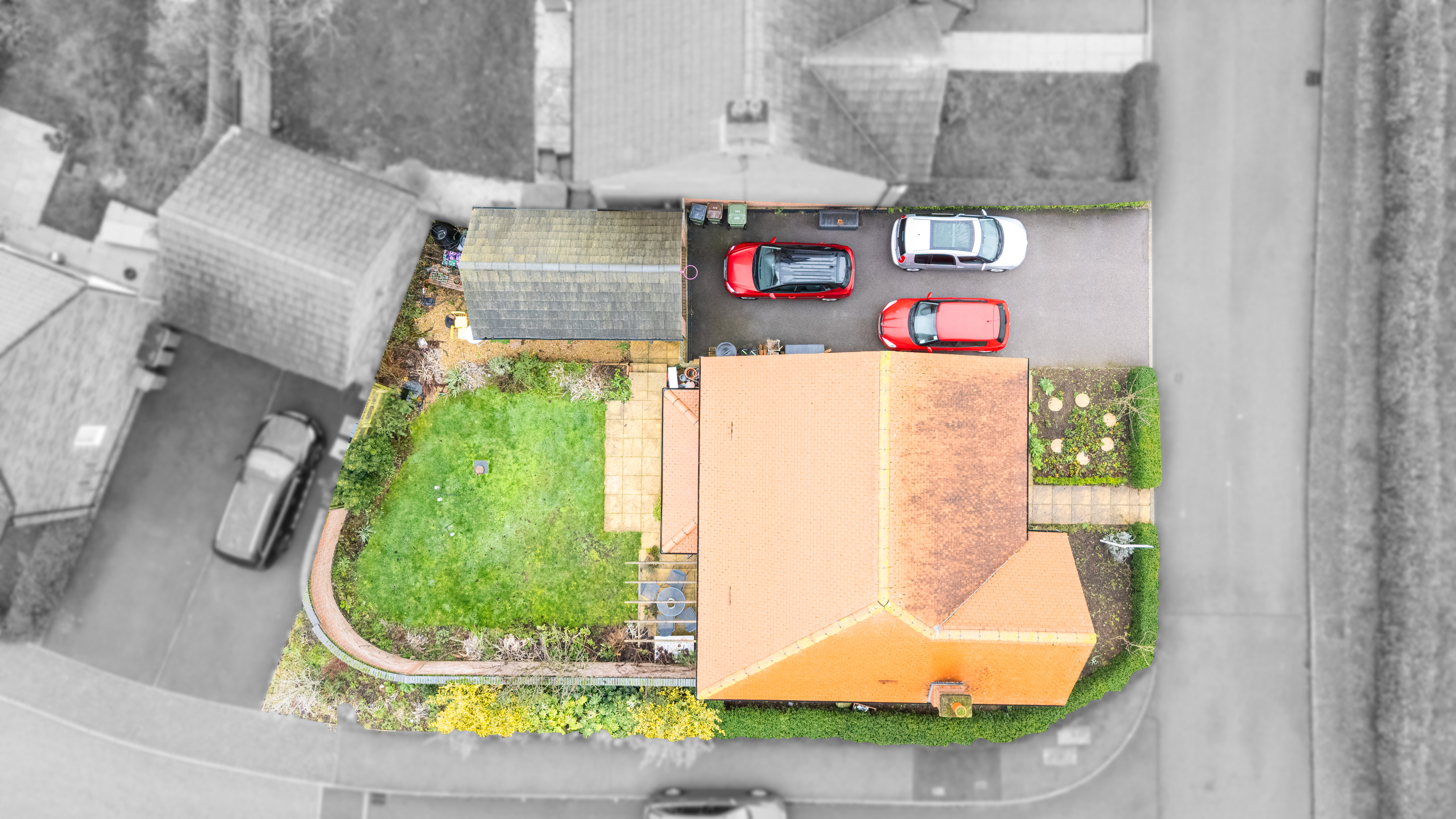 Externally, to the front, the property enjoys views over landscaped communal green space, with a planted garden area, hedging, and pathway leading to the entrance.