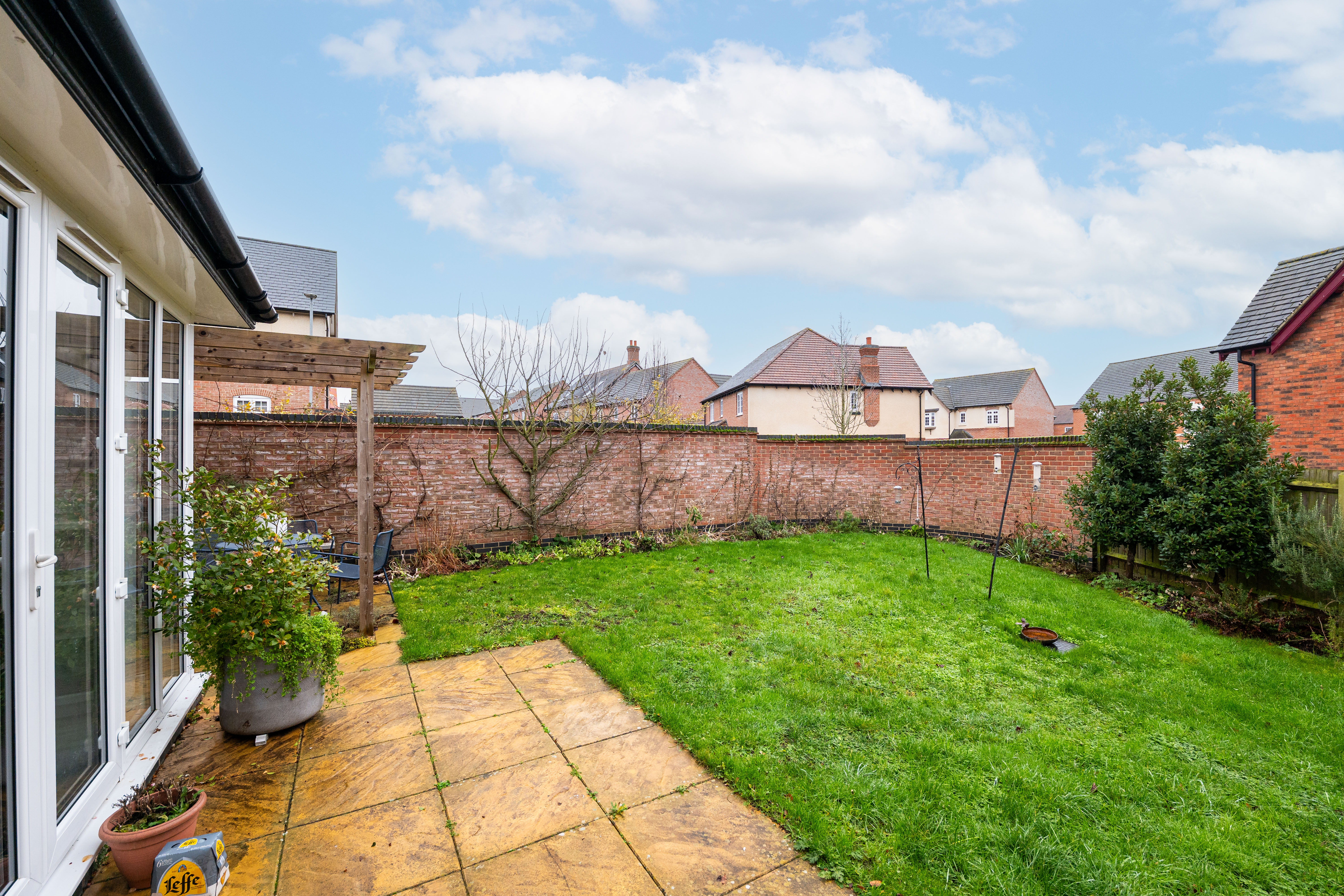 The rear garden features a paved seating area with pergola, lawn, established planting, an external water tap, and gated side access.