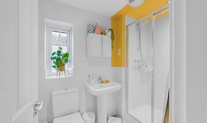 Comprising a shower enclosure, WC, wash basin, radiator, extractor fan, shaver point, part-tiled walls, and side window.