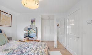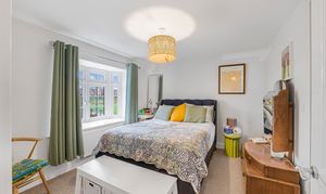 A well-proportioned main bedroom with front-facing window, leading through to a dressing area and private en-suite.