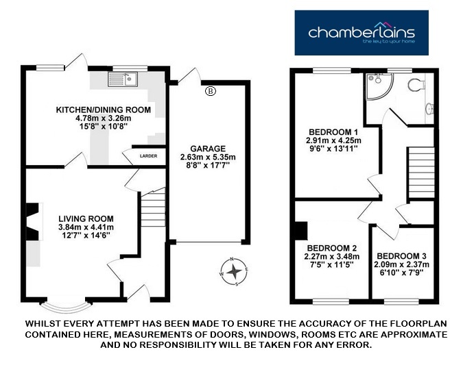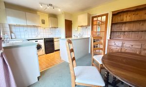 The kitchen/diner offers a practical and functional layout, fitted with cream wall and base units complemented by pale green worktops. There is space and plumbing for a washing machine, cooker, and under-counter fridge and freezer, while a good-sized pantry provides valuable additional storage. A door opens directly onto the rear garden, making it easy to access outdoor storage or enjoy the garden during warmer months.