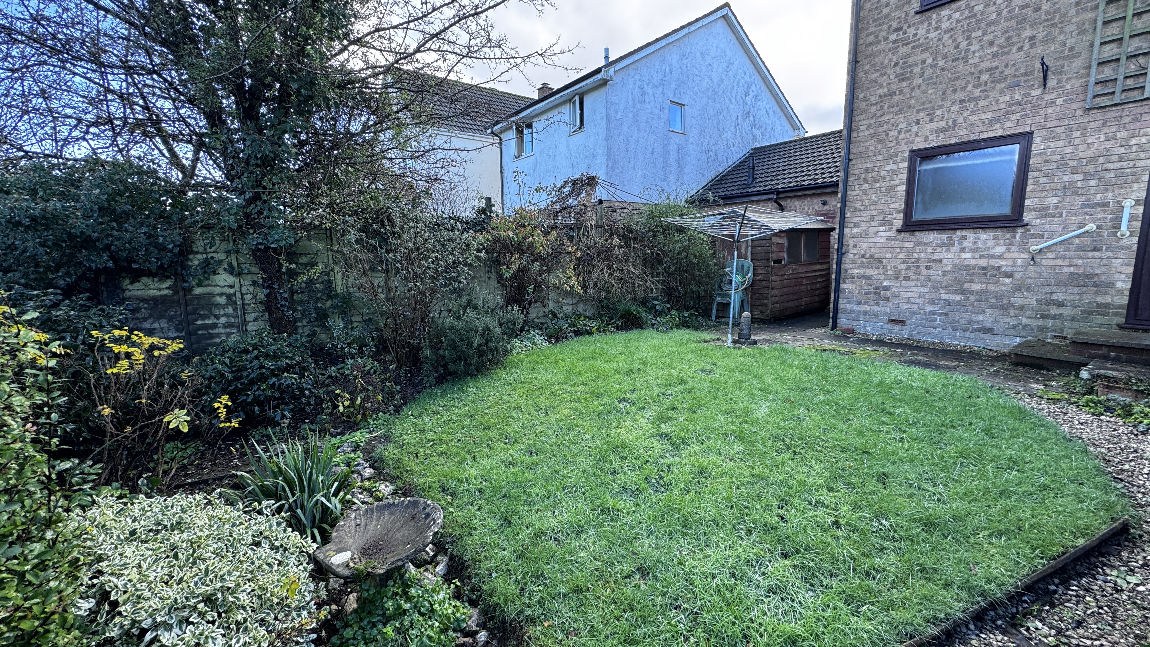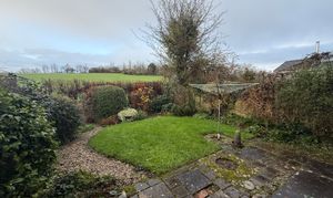 The rear garden is a practical and established outdoor area, featuring a range of mature shrubs and plants. A path runs through the garden to the shed and leads to a rear access door into the garage, making storage and access straightforward. The garden backs onto fields, which provide a good level of privacy and a more open feel than many residential gardens.