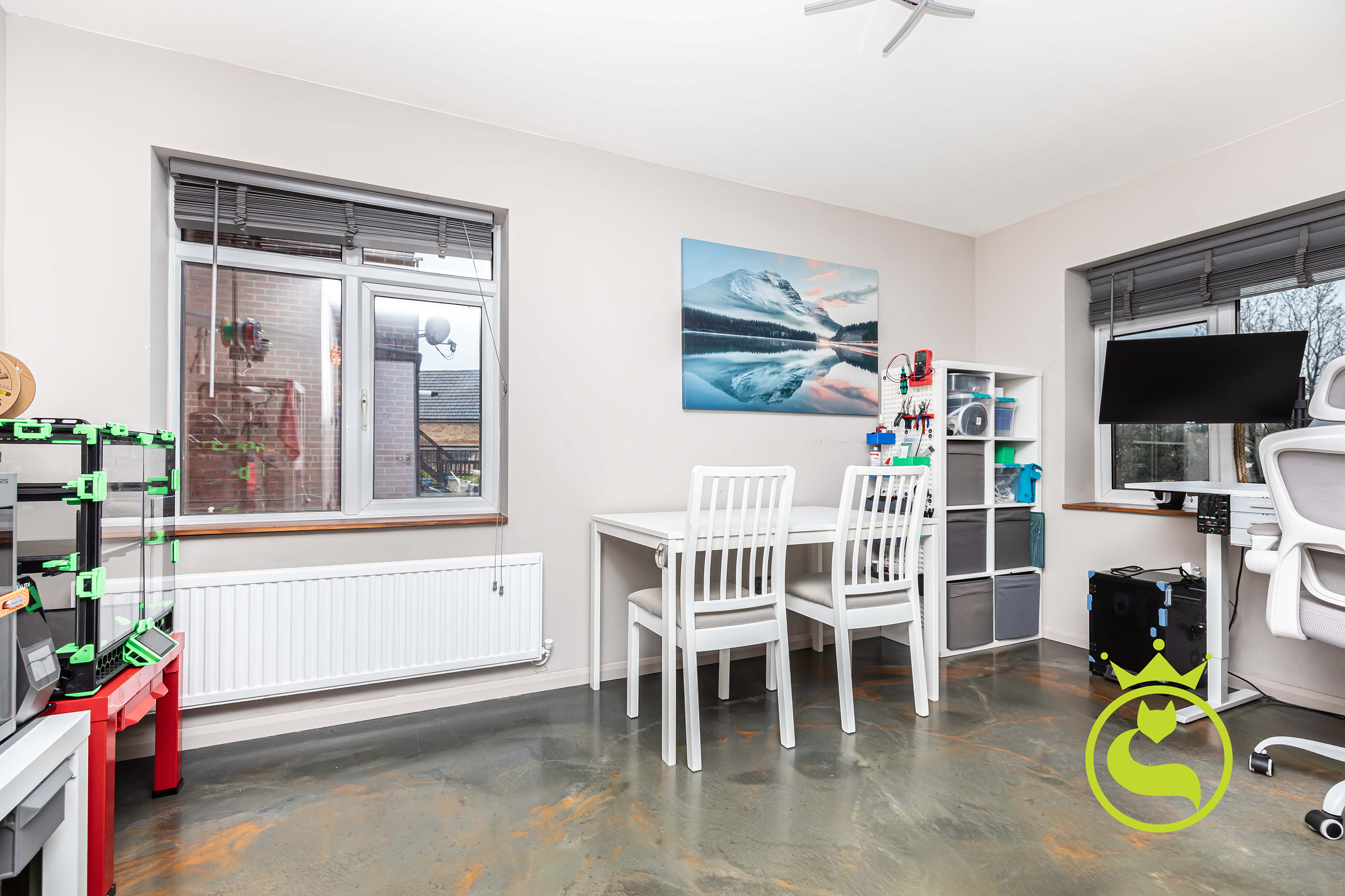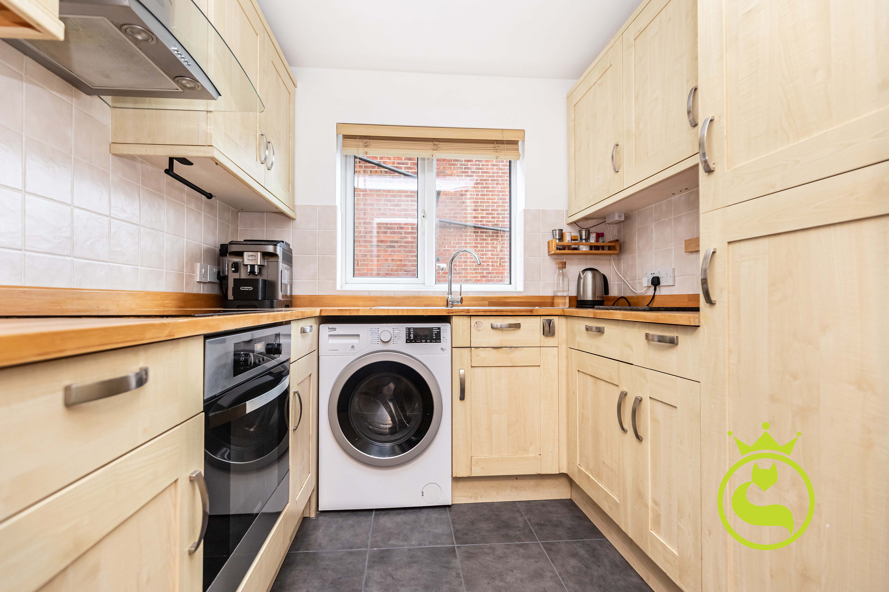 The lounge/diner is generously sized, providing ample space for both living and dining furniture, and enjoys a bright and airy feel thanks to its dual-aspect windows. The modern kitchen is well appointed with a range of units and integrated appliances, including a fridge/freezer, washer/dryer machine, and oven.