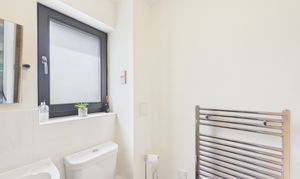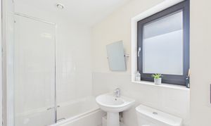 Part tiled, this modern, neutrally presented bathroom offers a shower over bath with screen, sink, WC and towel-style radiator (can be heated independently of the central heating).