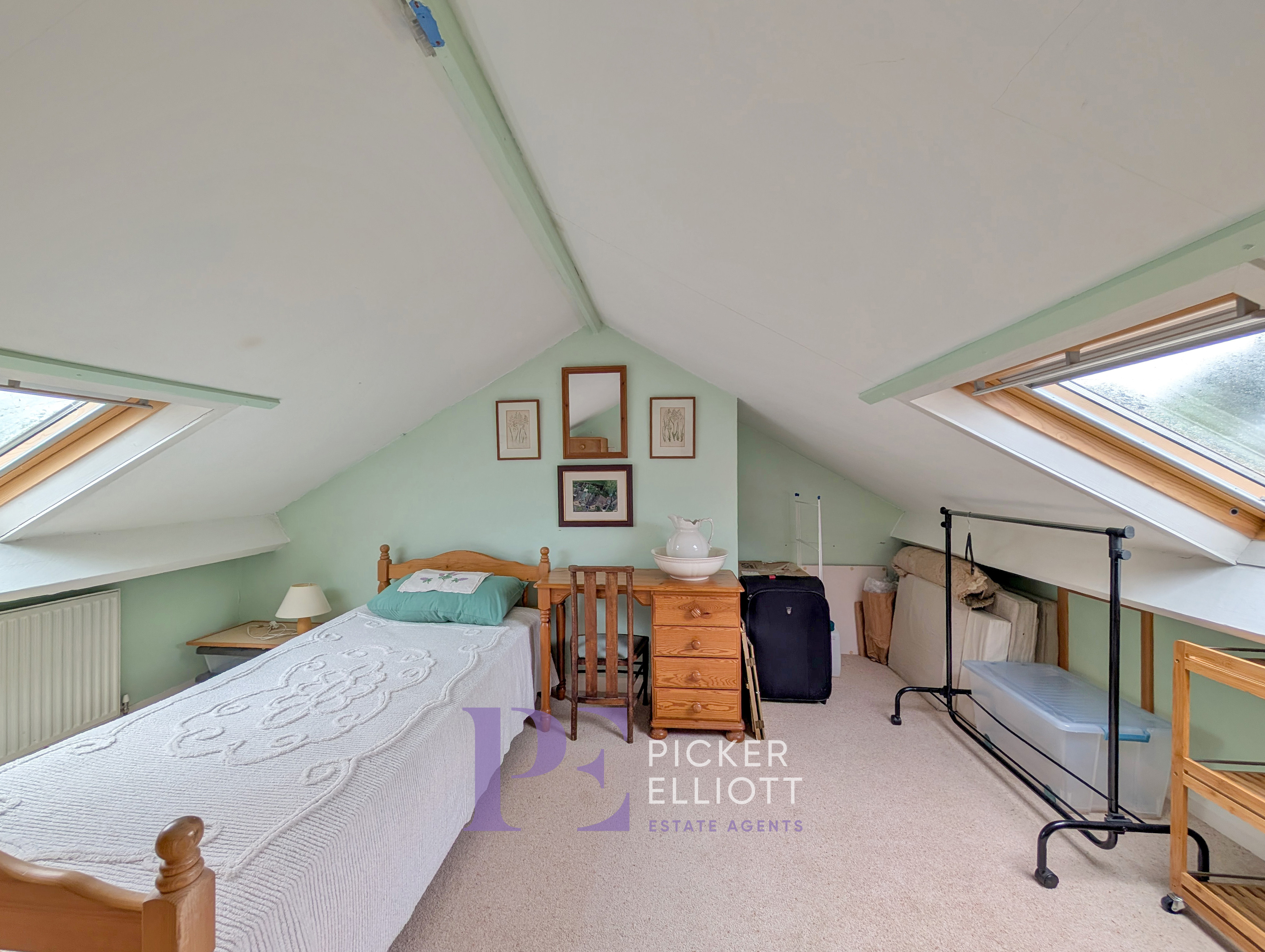 A small mezzanine, from which you enter the room, has shallow steps leading down to the main area. This raised level also features a handy underfloor storage space. The main room is a bespoke space, finished with pine, exposed brick, and a tiled floor. Natural light floods in from two large skylights and a large UPVC window that frames a view of the garden. A UPVC patio door provides level access to the outside.