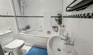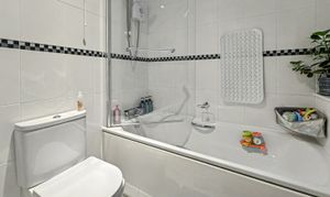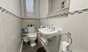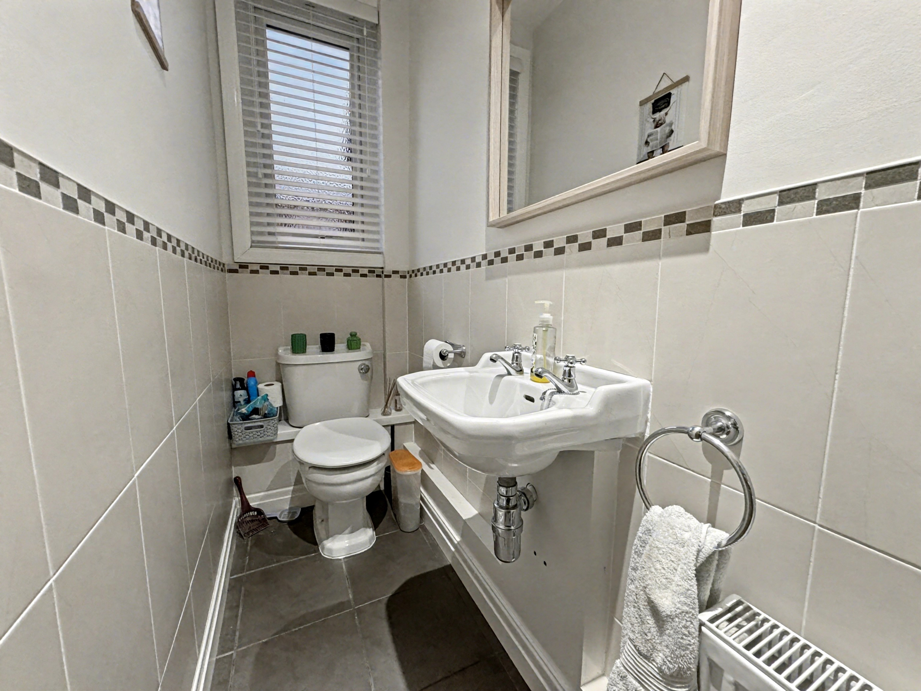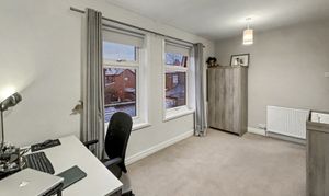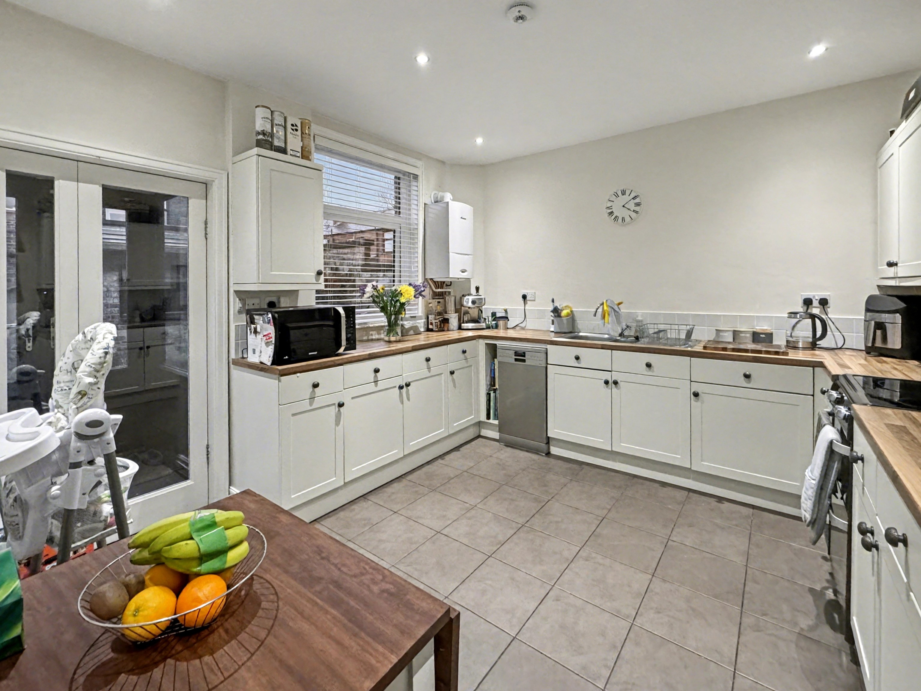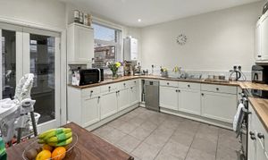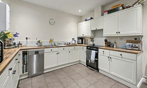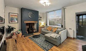 To the first floor, there are two generous double bedrooms, with the main bedroom benefitting from a walk-in wardrobe. The family bathroom is beautifully appointed and features a Velux window, allowing natural light to enhance the space.