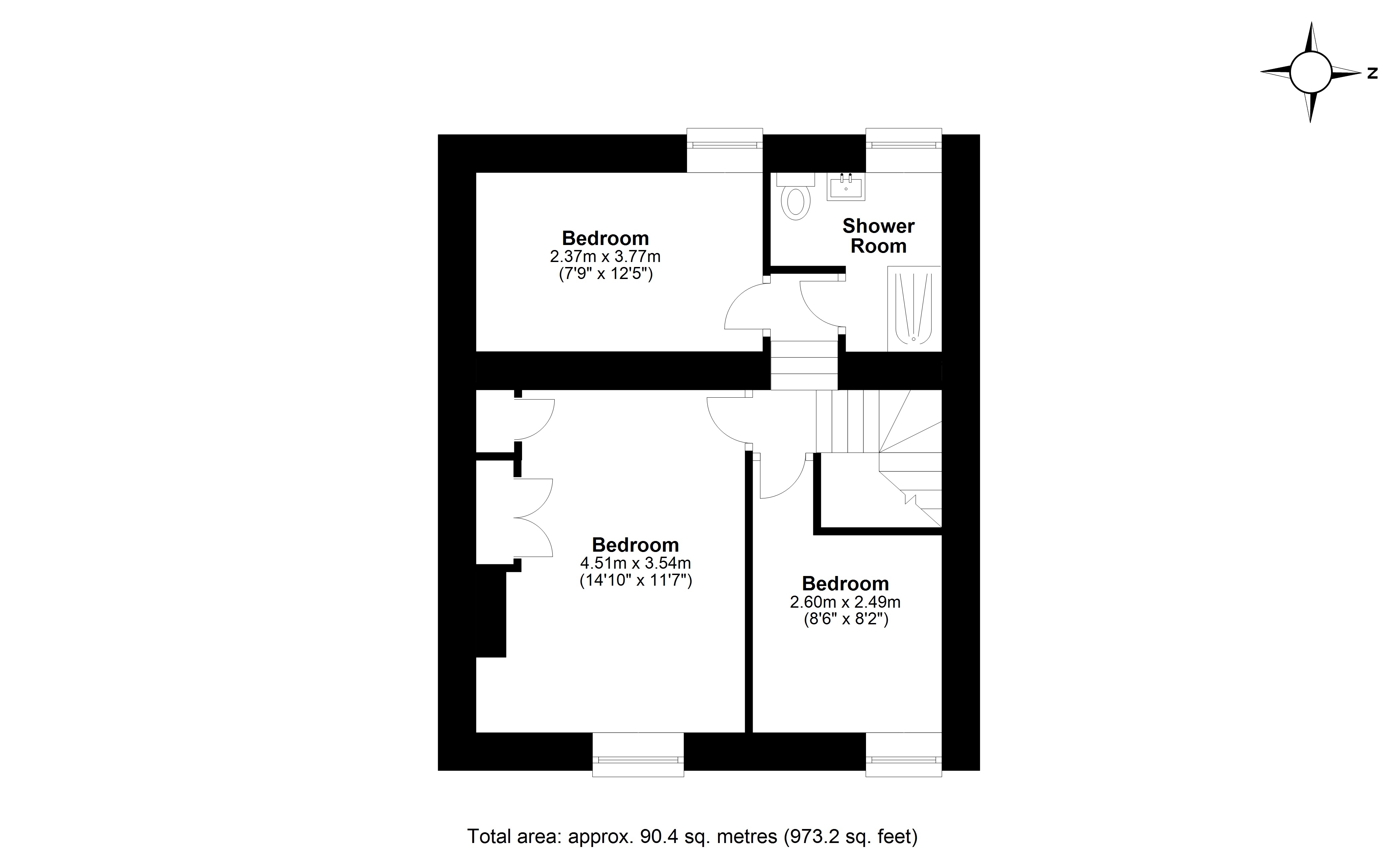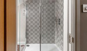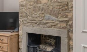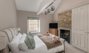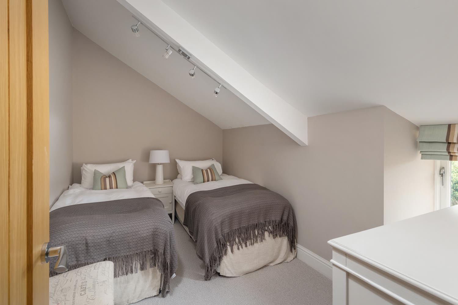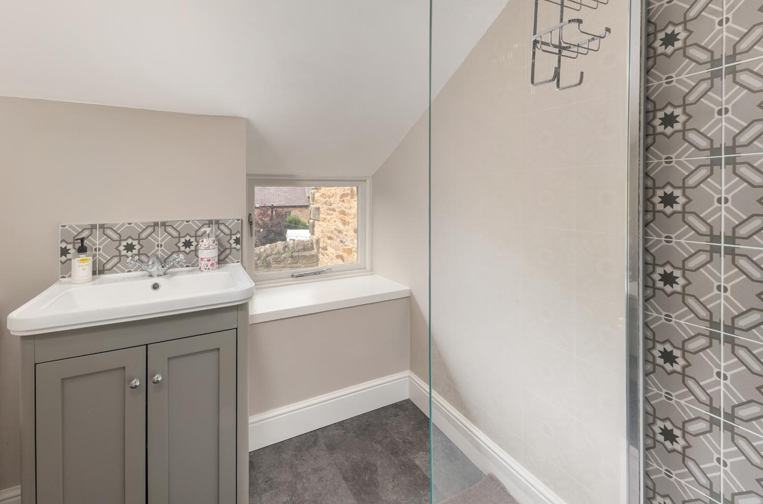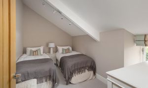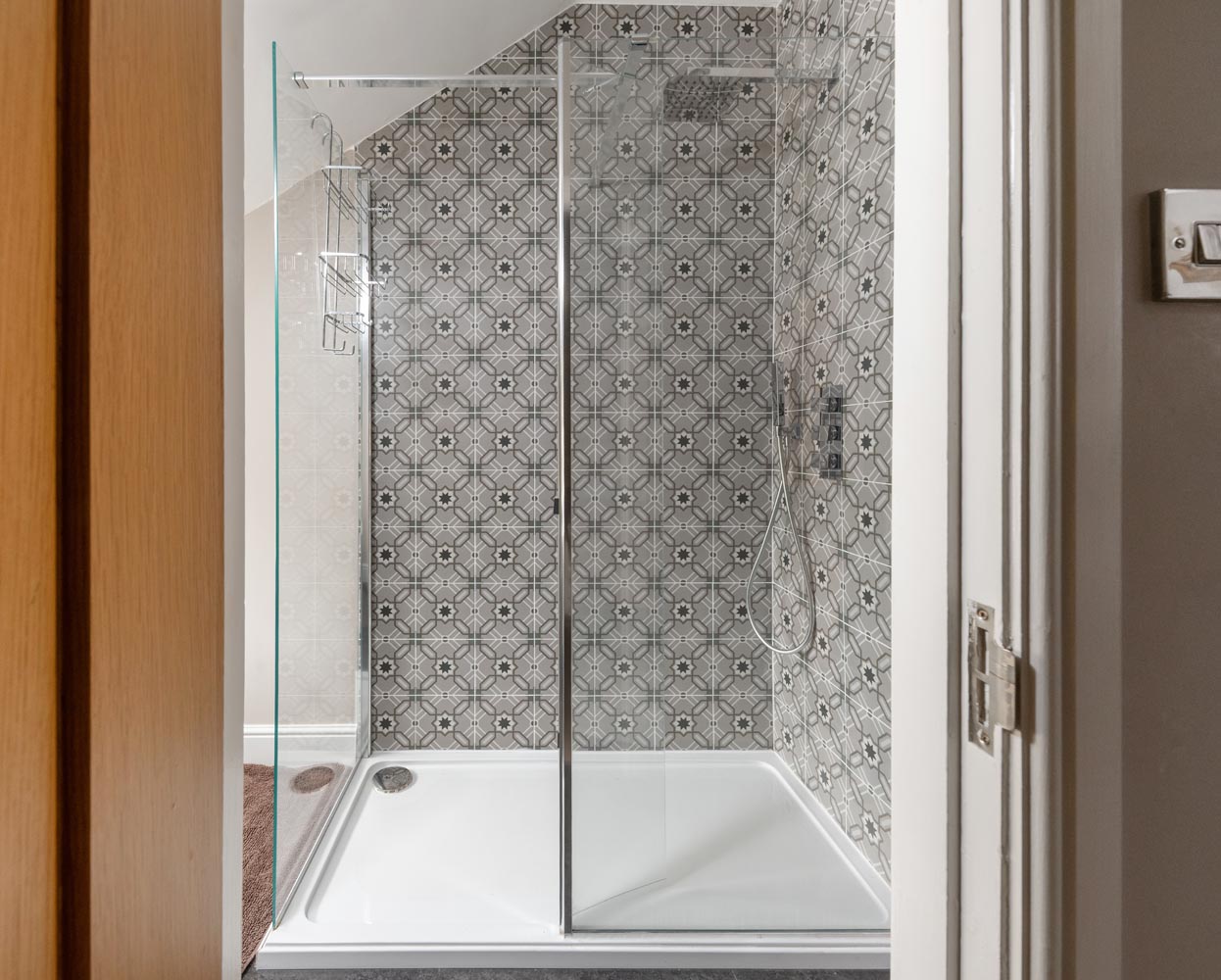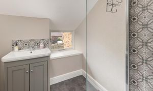 Upstairs, three double bedrooms are decorated in calm, neutral tones and enjoy good natural light. The principal bedroom is generously sized, with a vaulted ceiling, painted trusses and a statement stone chimney breast with a fireplace, together with fitted cupboards for organised storage. The second double bedroom sits alongside, and the third is equally versatile, readily adapted as a study, nursery or dressing room as required. The shower room has been renovated in a contemporary style, with a wide glazed enclosure, patterned tiling and a rainfall shower.