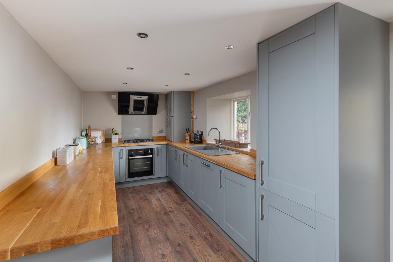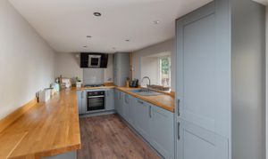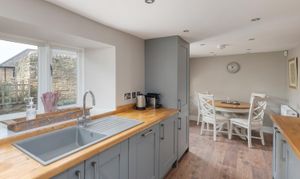 The front door opens into a remarkably spacious sitting room, a welcoming space for relaxed evenings or informal entertaining. Painted beams draw the eye upward and add a refined, contemporary finish, while a period fireplace forms a natural focal point, and built-in storage offers practical appeal. Beyond, the kitchen and dining area extend across the rear of the house, combining Shaker-style cabinetry in generous supply with warm timber worktops and integrated appliances including an oven with gas hob, extractor, washing machine and dishwasher. The dining area sits beside a feature wall of exposed stone, creating a charming setting for meals, and a door opens directly from here to the rear terrace.
