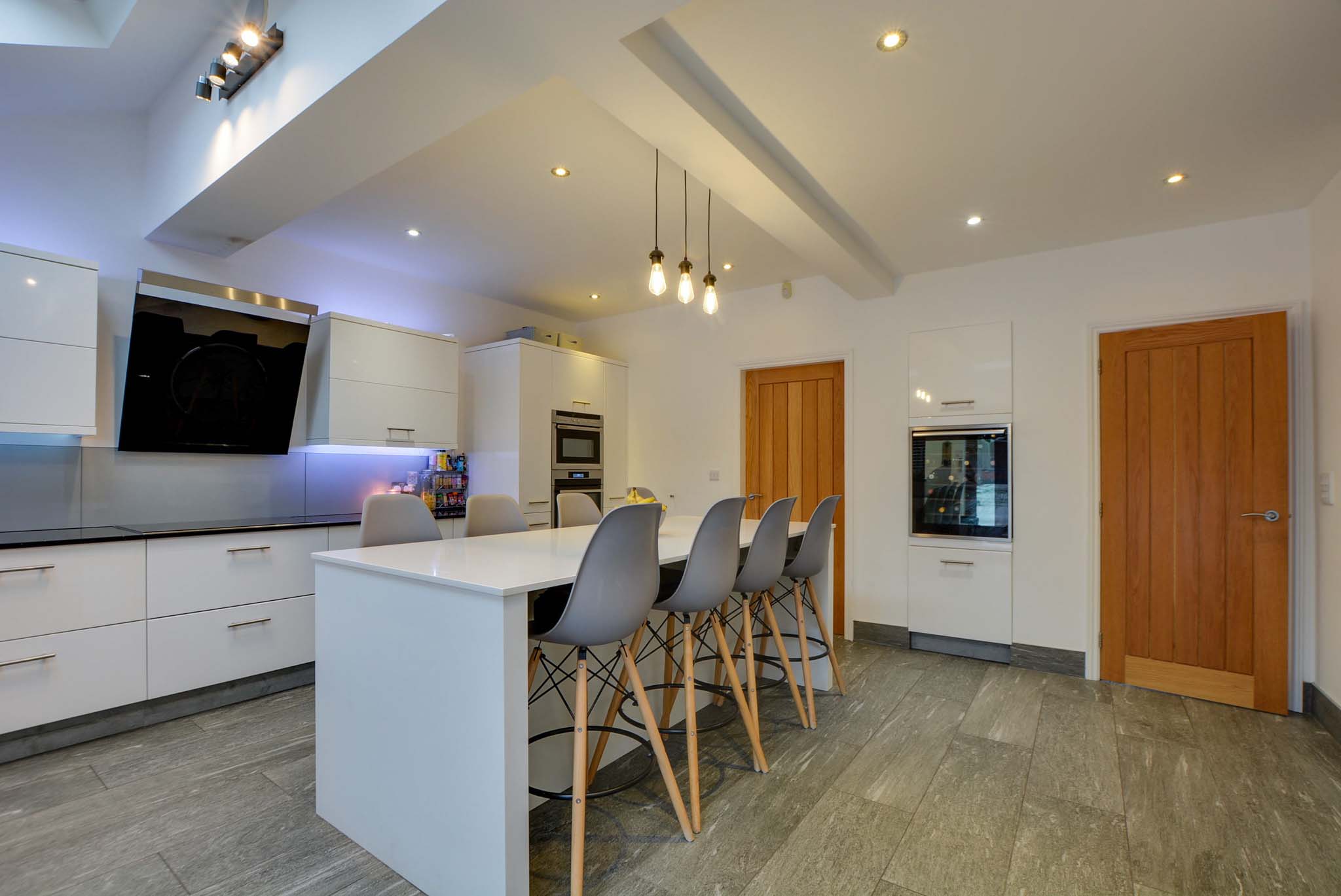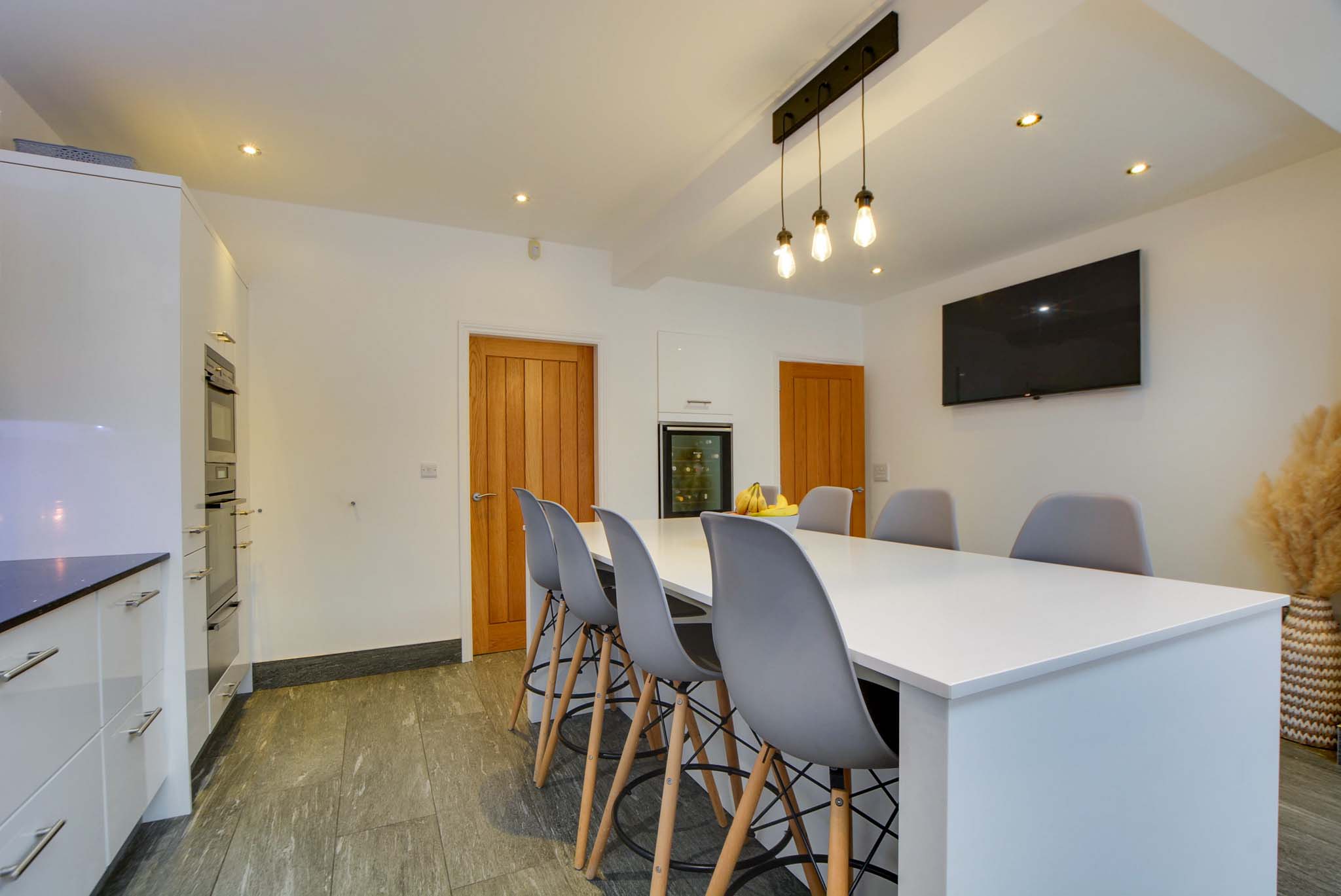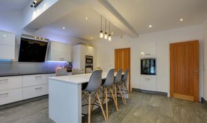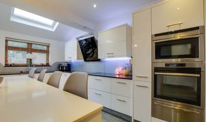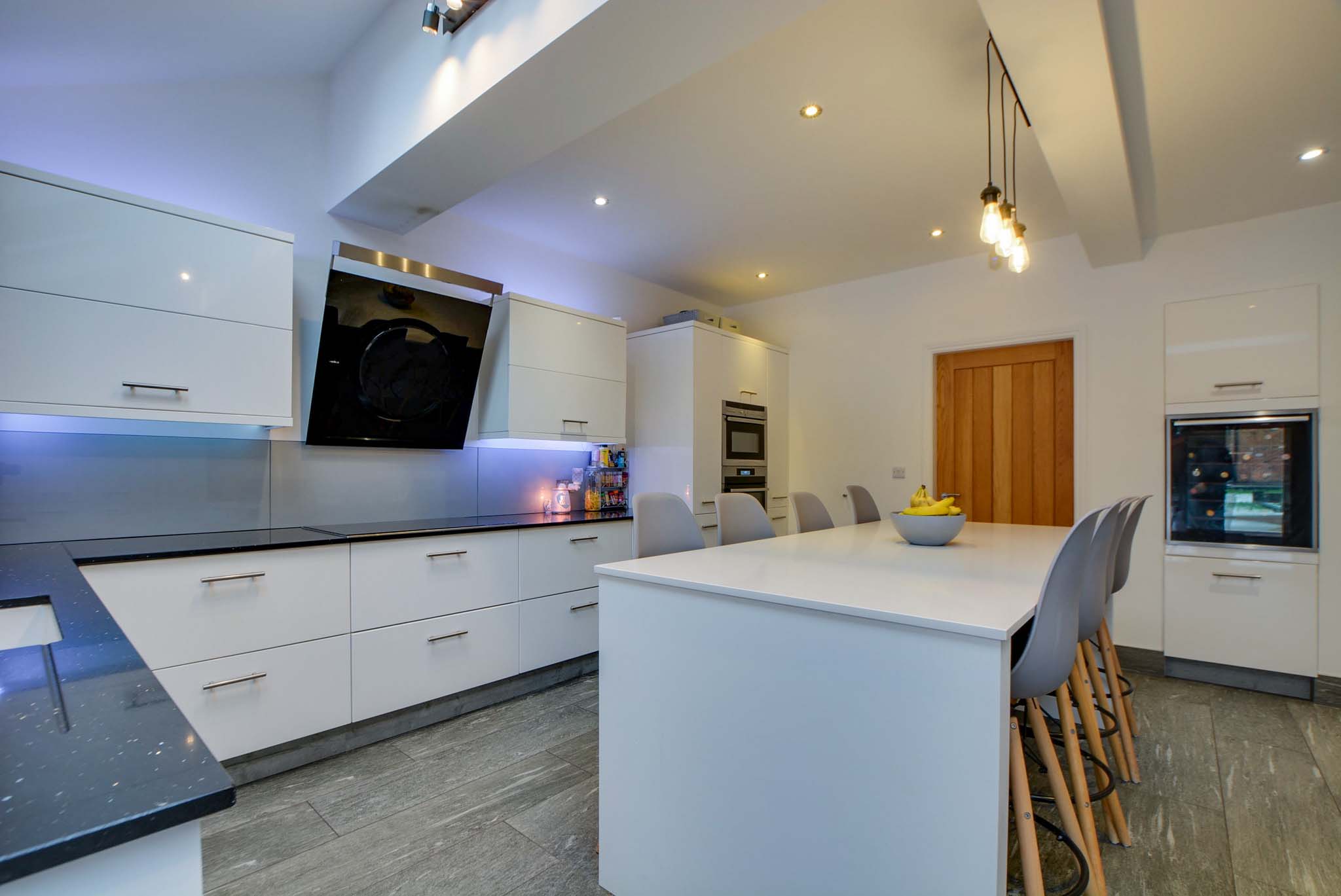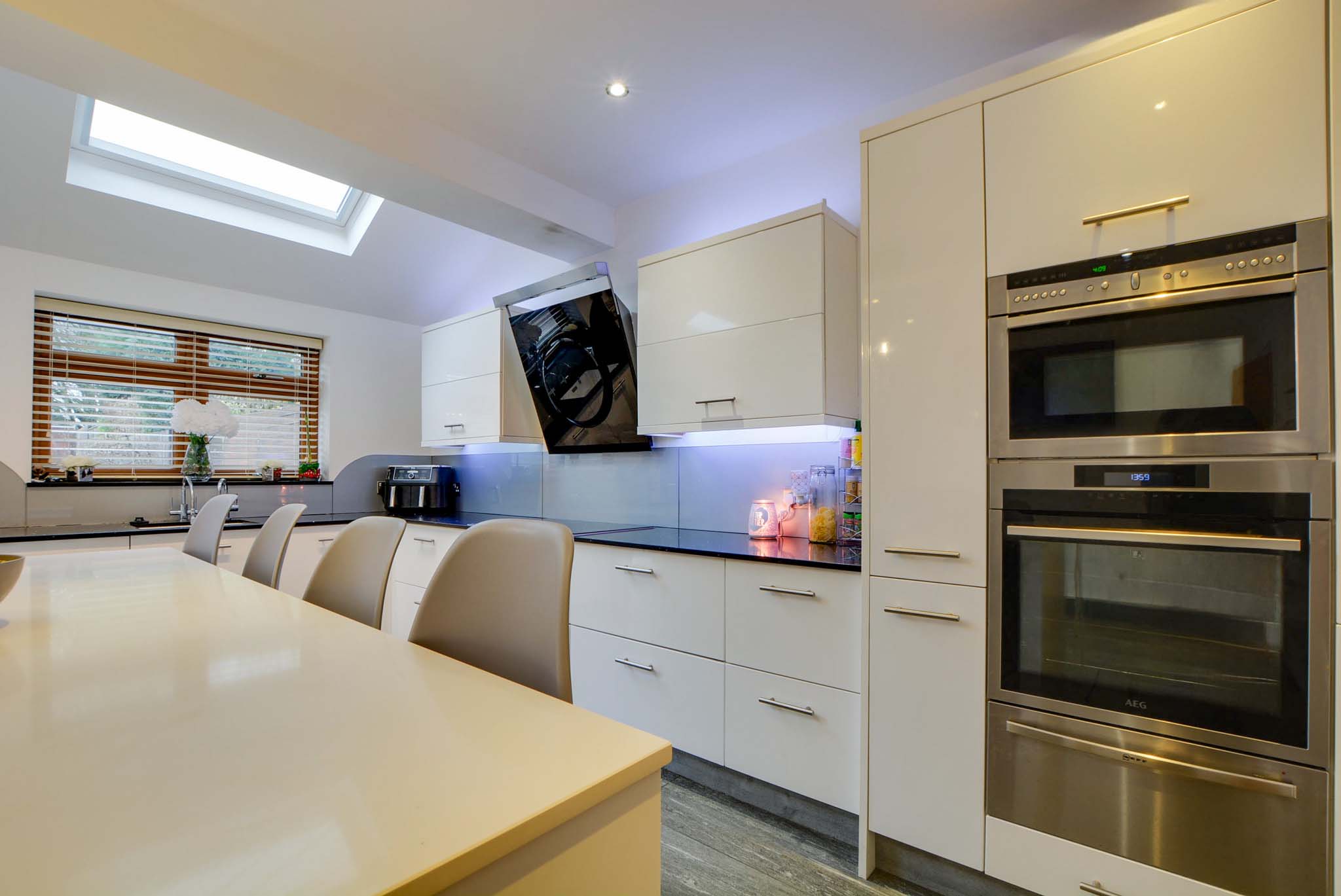With two double-glazed skylight windows with electric opening and electric blind, a double-glazed window to the rear elevation, double-glazed French doors to the rear garden, porcelain tiled flooring, underfloor heating, a range of white glossed wall and base units with Silestone granite work surfaces over, sink, drainer, chrome mixer tap, additional steaming hot water tap and waste disposal, stylish ceramic induction hob, double oven, warming draw, feature extraction hood, fridge, freezer, dishwasher, wine chiller, TV point, spotlights, door to the utility room.